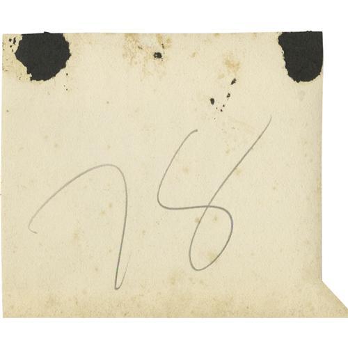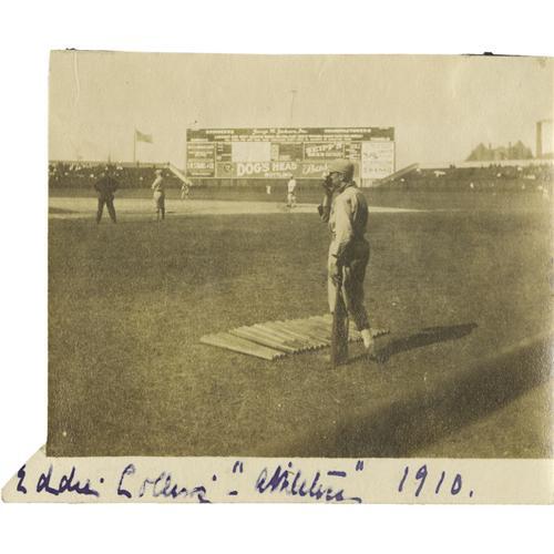 <B>1910 Eddie Collins Photographic Snapshot at Shibe Park.</B></I> The speedy Hall of Fame second baseman shouts instructions or encouragement to his teammates from just outside the Philadelphia Athletics dugout. Size is 3.25x3.25, not including the handwritten identifying lower border area. Scrapbook remnants on verso do not affect image, which is otherwise free of noteworthy flaws. One of three snapshots taken that day that we present in this auction.<BR><BR><b>Shipping:</b> Flat Material, Small (<a target="_blank" href="http://www.heritageauctions.com/common/shipping.php">view shipping information</a>)