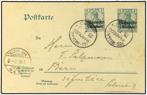 1910 German Post Offices in Morocco postal stationary card 5 cents on 5 pf green upgraded with 5 cent on 5 pf green (SG 27) tied by FES-MELLAH datestamp addressed to Bern with adjacent arrival cachet. A very rare cancel from the Jewish Quarter.
