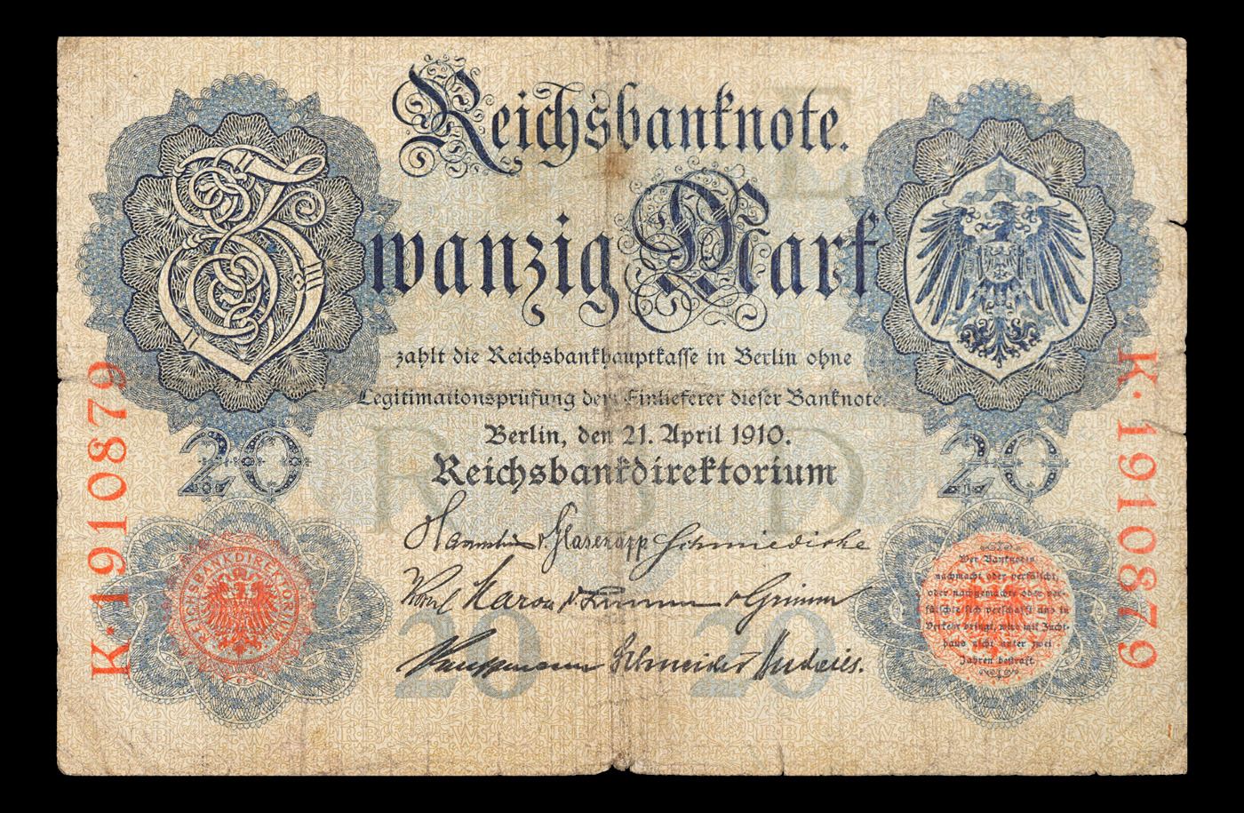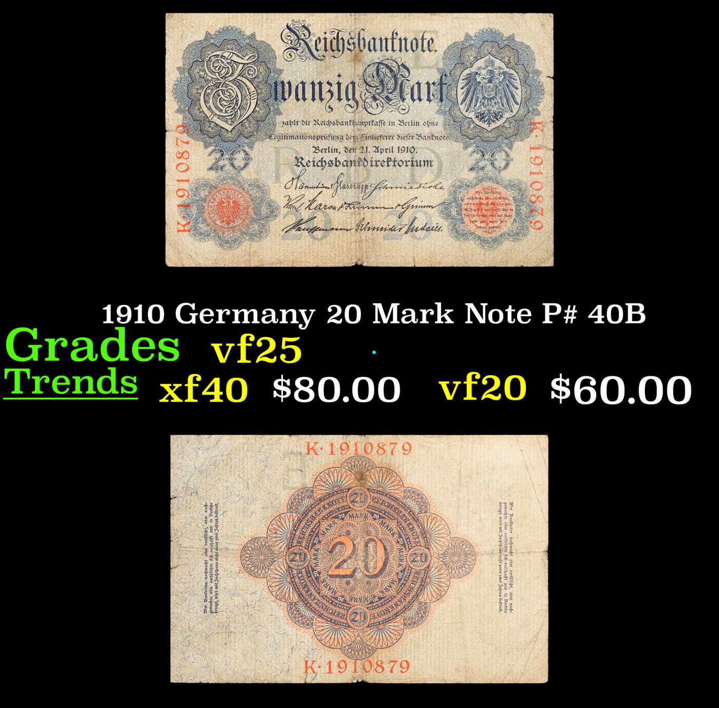 1910 Germany 20 Mark Note P# 40B Grades vf+.