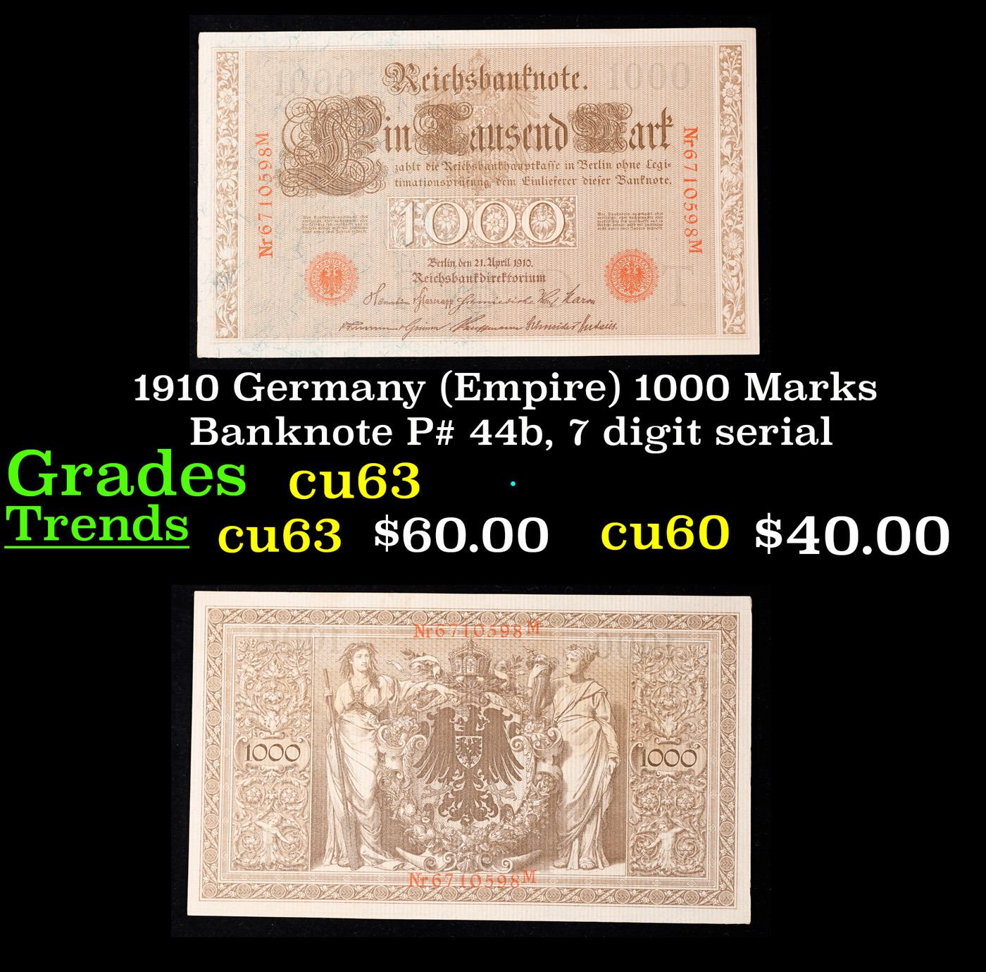 1910 Germany (Empire) 1000 Marks Banknote P# 44b, 7 digit serial Grades Select CU
