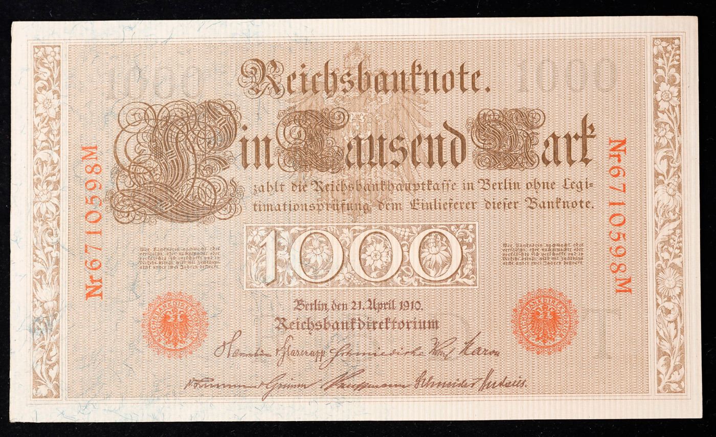 1910 Germany (Empire) 1000 Marks Banknote P# 44b, 7 digit serial Grades Select CU. From 1871 to 1914 the German Mark was known as the "Goldmark", as it was on the gold standard. During WWI, like most nations, Germany removed the gold backing and ceased circulation of gold coins. The Goldmark was the culmination of years of effort put into unifying the currency of Germany.
