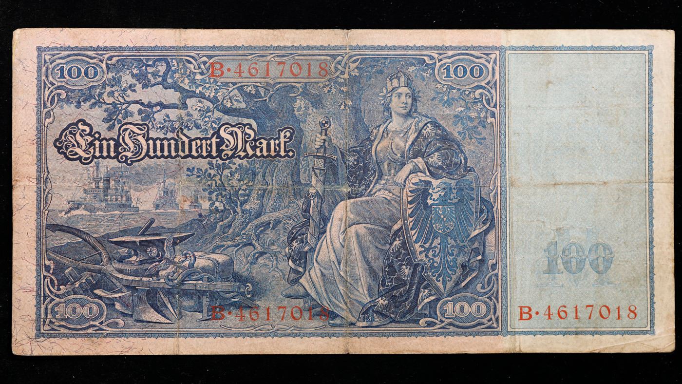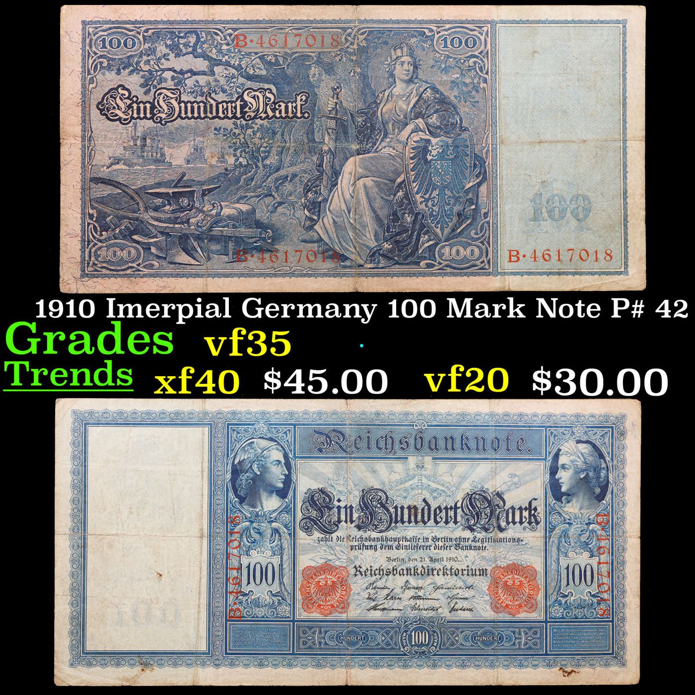 1910 Imerpial Germany 100 Mark Note P# 42 Grades vf++. From 1871 to 1914 the German Mark was known as the "Goldmark", as it was on the gold standard. During WWI, like most nations, Germany removed the gold backing and ceased circulation of gold coins. The Goldmark was the culmination of years of effort put into unifying the currency of Germany.
