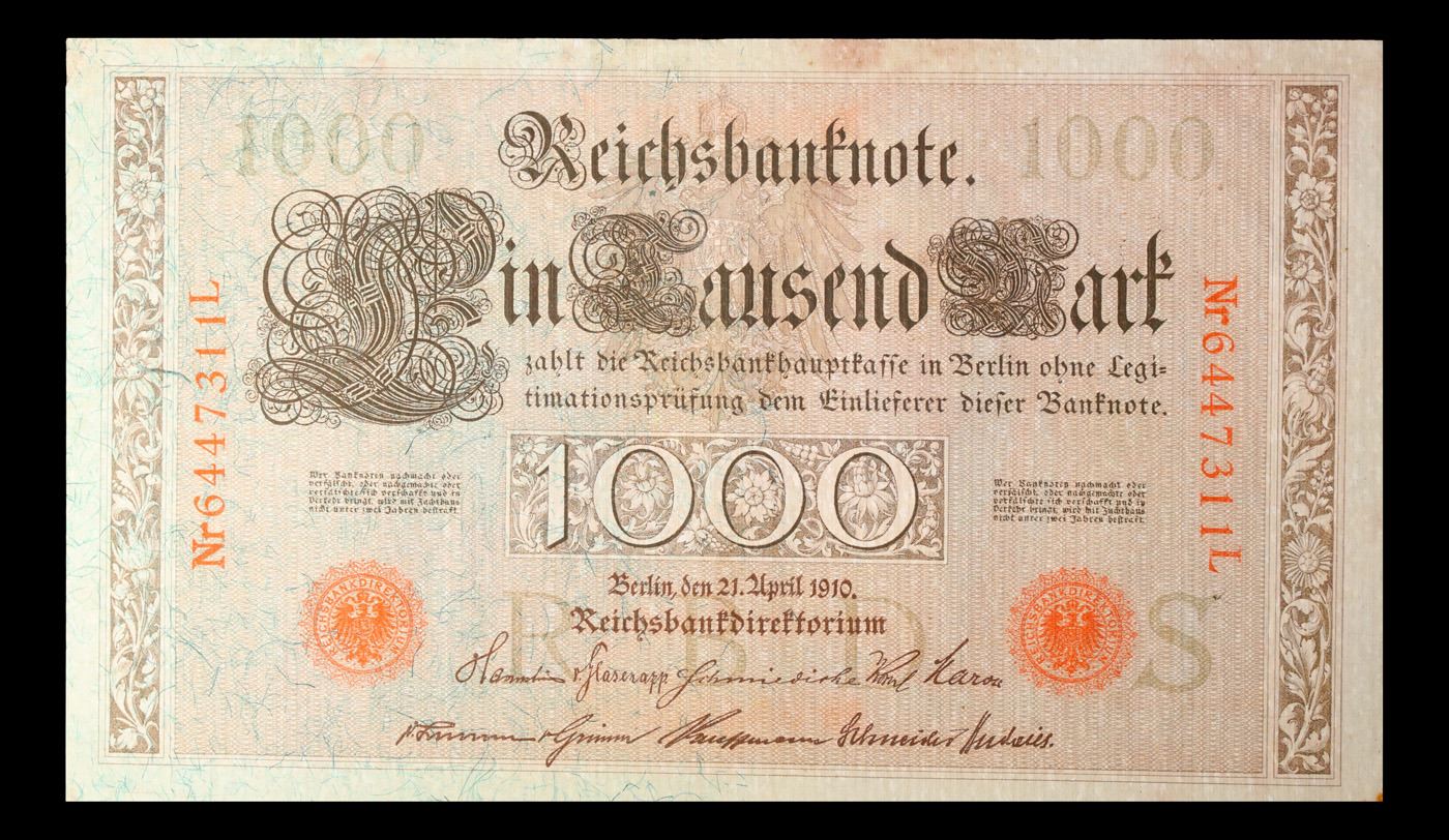 1910 Imperial Germany 1,000 Mark Note P: 44B Grades Choice AU/BU Slider. From 1871 to 1914 the German Mark was known as the "Goldmark", as it was on the gold standard. During WWI, like most nations, Germany removed the gold backing and ceased circulation of gold coins. The Goldmark was the culmination of years of effort put into unifying the currency of Germany.