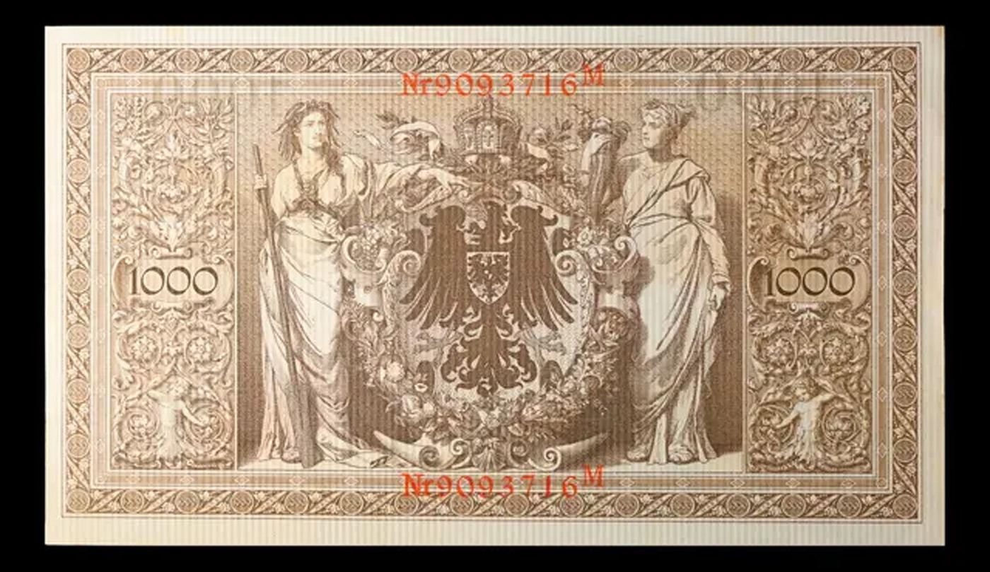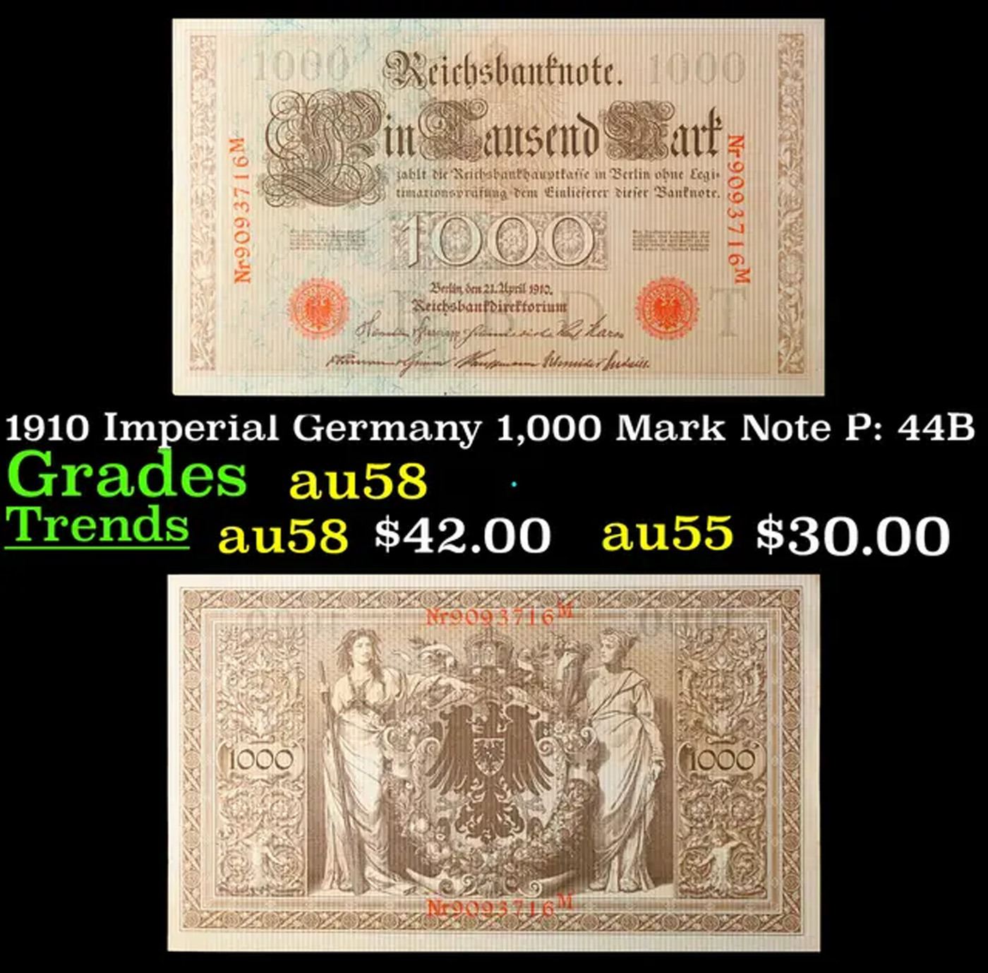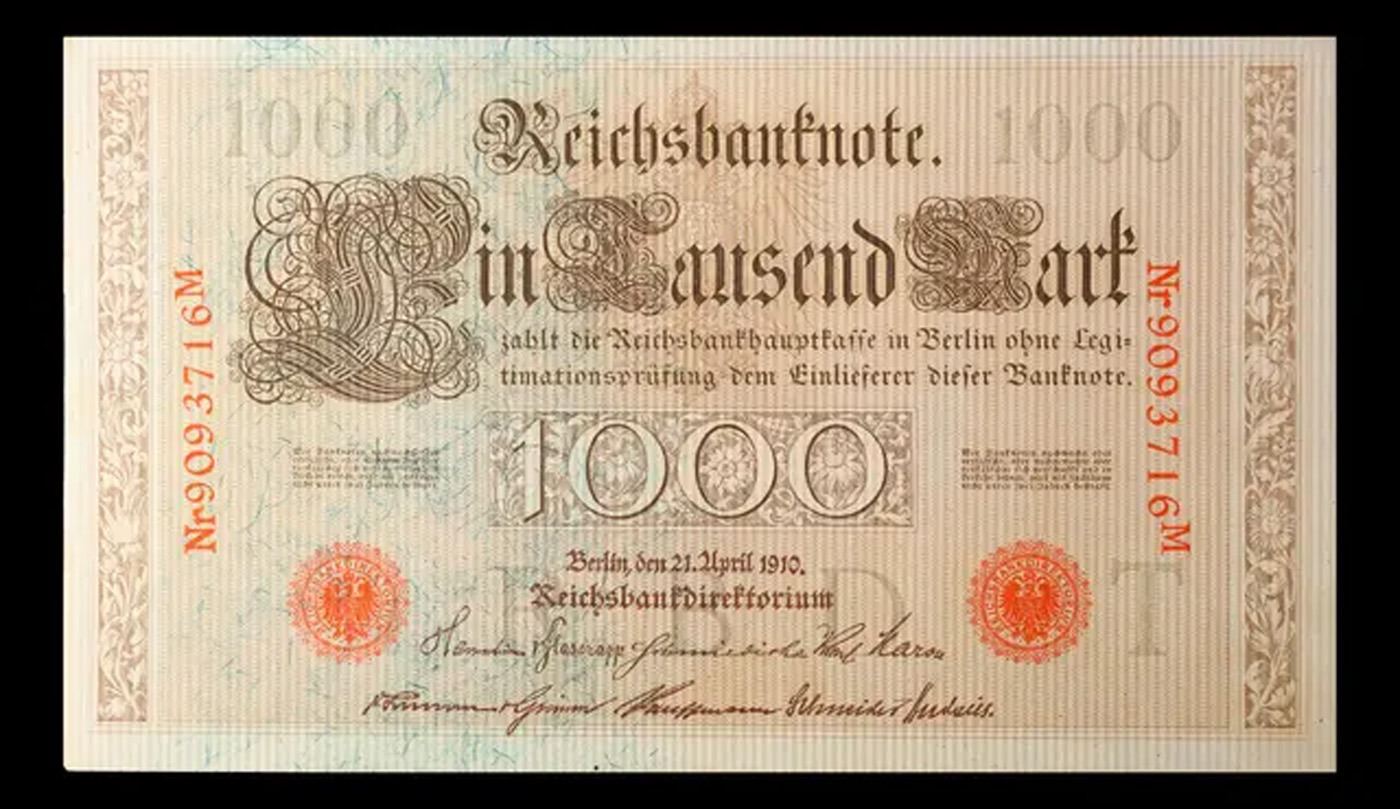 1910 Imperial Germany 1,000 Mark Note P: 44B Grades Choice AU/BU Slider. From 1871 to 1914 the German Mark was known as the "Goldmark", as it was on the gold standard. During WWI, like most nations, Germany removed the gold backing and ceased circulation of gold coins. The Goldmark was the culmination of years of effort put into unifying the currency of Germany.