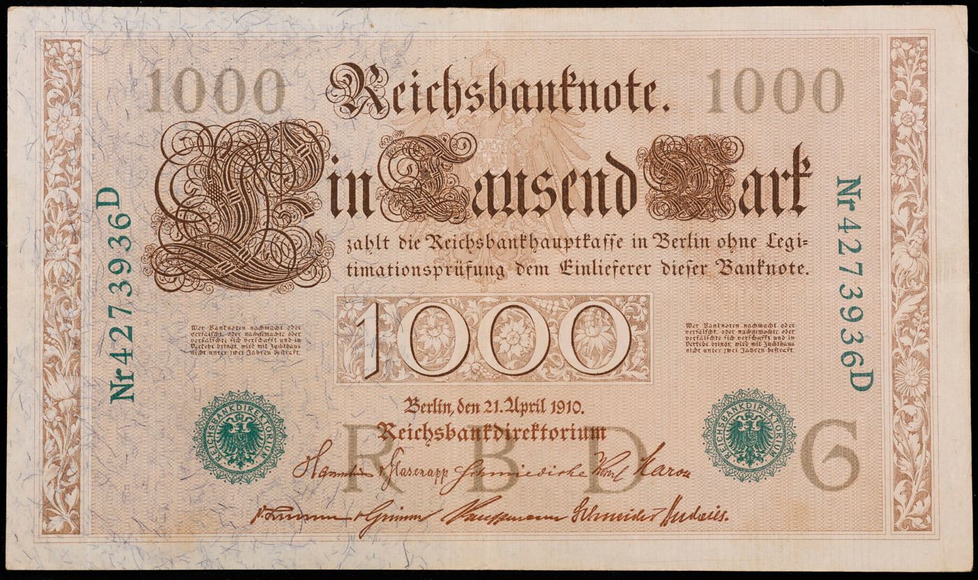 1910 Imperial Germany 1,000 Mark Note P: 45B Grades Choice AU/BU Slider. From 1871 to 1914 the German Mark was known as the "Goldmark", as it was on the gold standard. During WWI, like most nations, Germany removed the gold backing and ceased circulation of gold coins. The Goldmark was the culmination of years of effort put into unifying the currency of Germany.