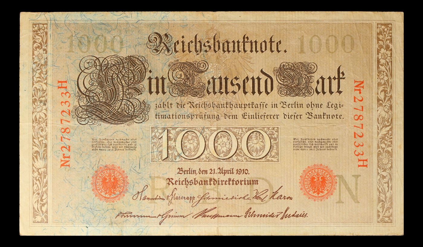 1910 Imperial Germany 1,000 mark Note P# 44B Grades Choice AU/BU Slider. From 1871 to 1914 the German Mark was known as the "Goldmark", as it was on the gold standard. During WWI, like most nations, Germany removed the gold backing and ceased circulation of gold coins. The Goldmark was the culmination of years of effort put into unifying the currency of Germany.