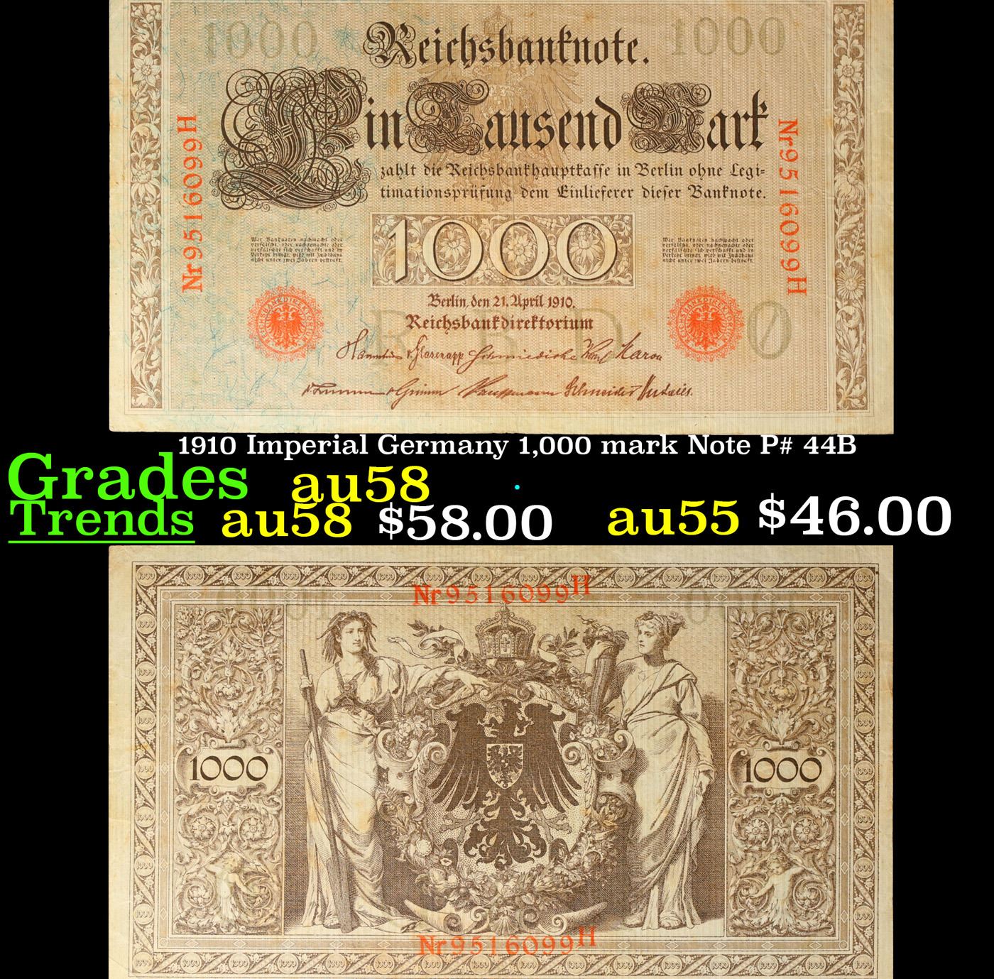 1910 Imperial Germany 1,000 mark Note P# 44B Grades Choice AU/BU Slider. From 1871 to 1914 the German Mark was known as the "Goldmark", as it was on the gold standard. During WWI, like most nations, Germany removed the gold backing and ceased circulation of gold coins. The Goldmark was the culmination of years of effort put into unifying the currency of Germany.