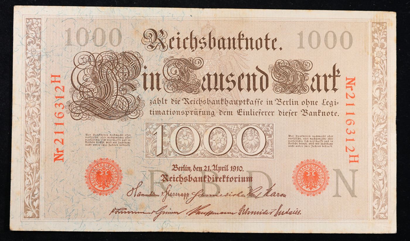 1910 Imperial Germany 1,000 mark Note P# 44B Grades Select AU. From 1871 to 1914 the German Mark was known as the "Goldmark", as it was on the gold standard. During WWI, like most nations, Germany removed the gold backing and ceased circulation of gold coins. The Goldmark was the culmination of years of effort put into unifying the currency of Germany.