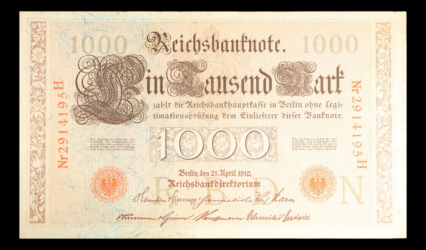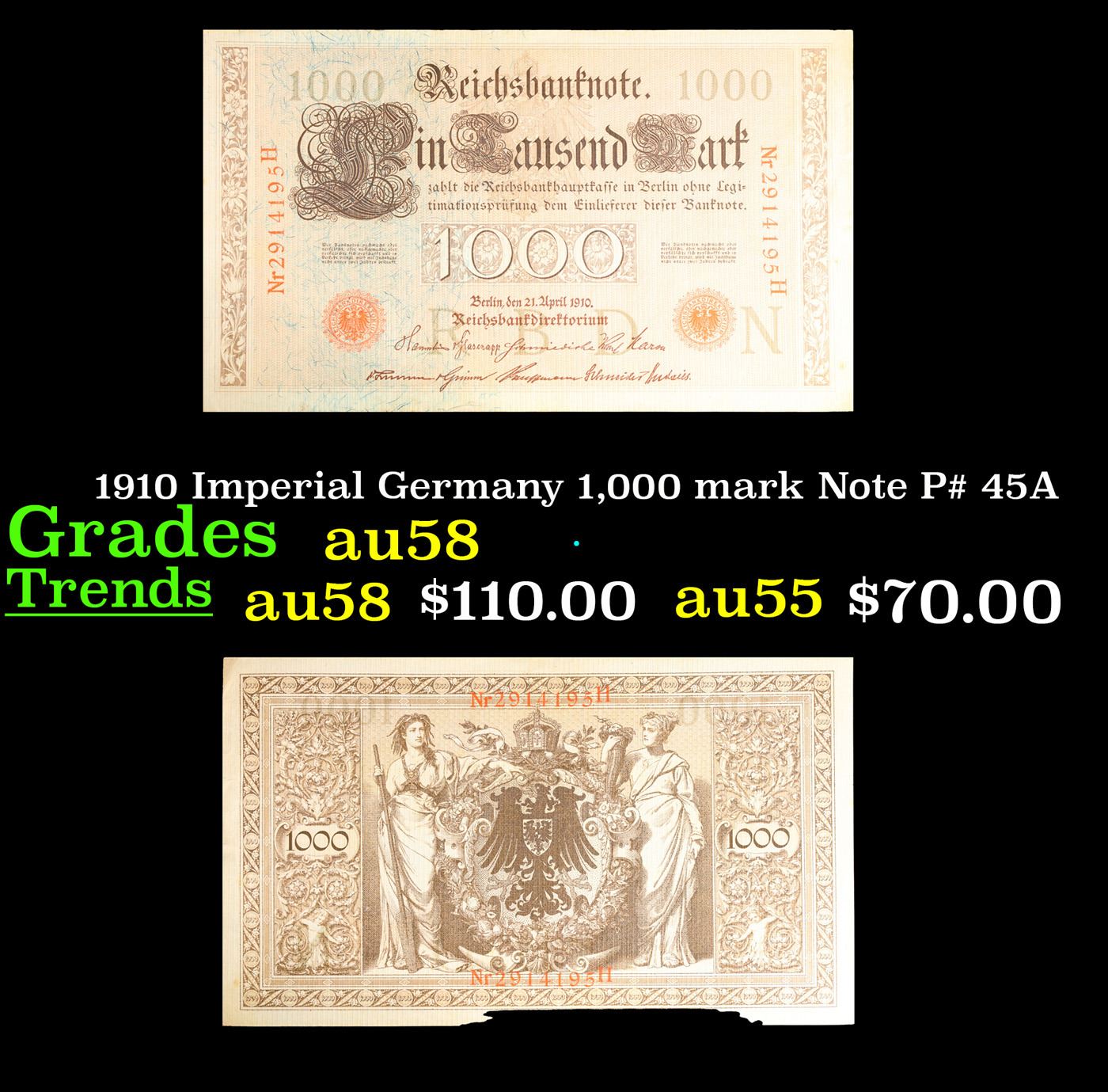 1910 Imperial Germany 1,000 mark Note P# 45A Grades Choice AU/BU Slider. From 1871 to 1914 the German Mark was known as the "Goldmark", as it was on the gold standard. During WWI, like most nations, Germany removed the gold backing and ceased circulation of gold coins. The Goldmark was the culmination of years of effort put into unifying the currency of Germany.
