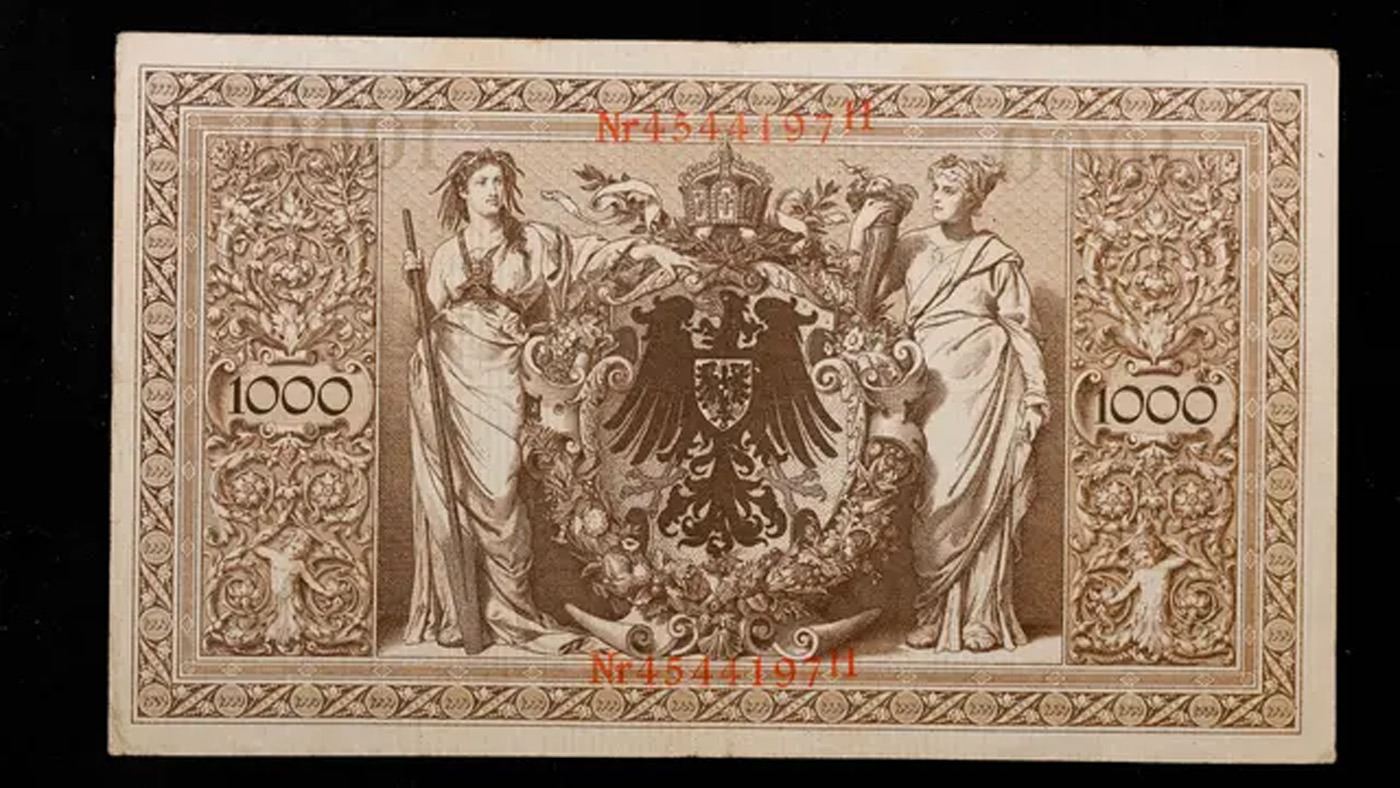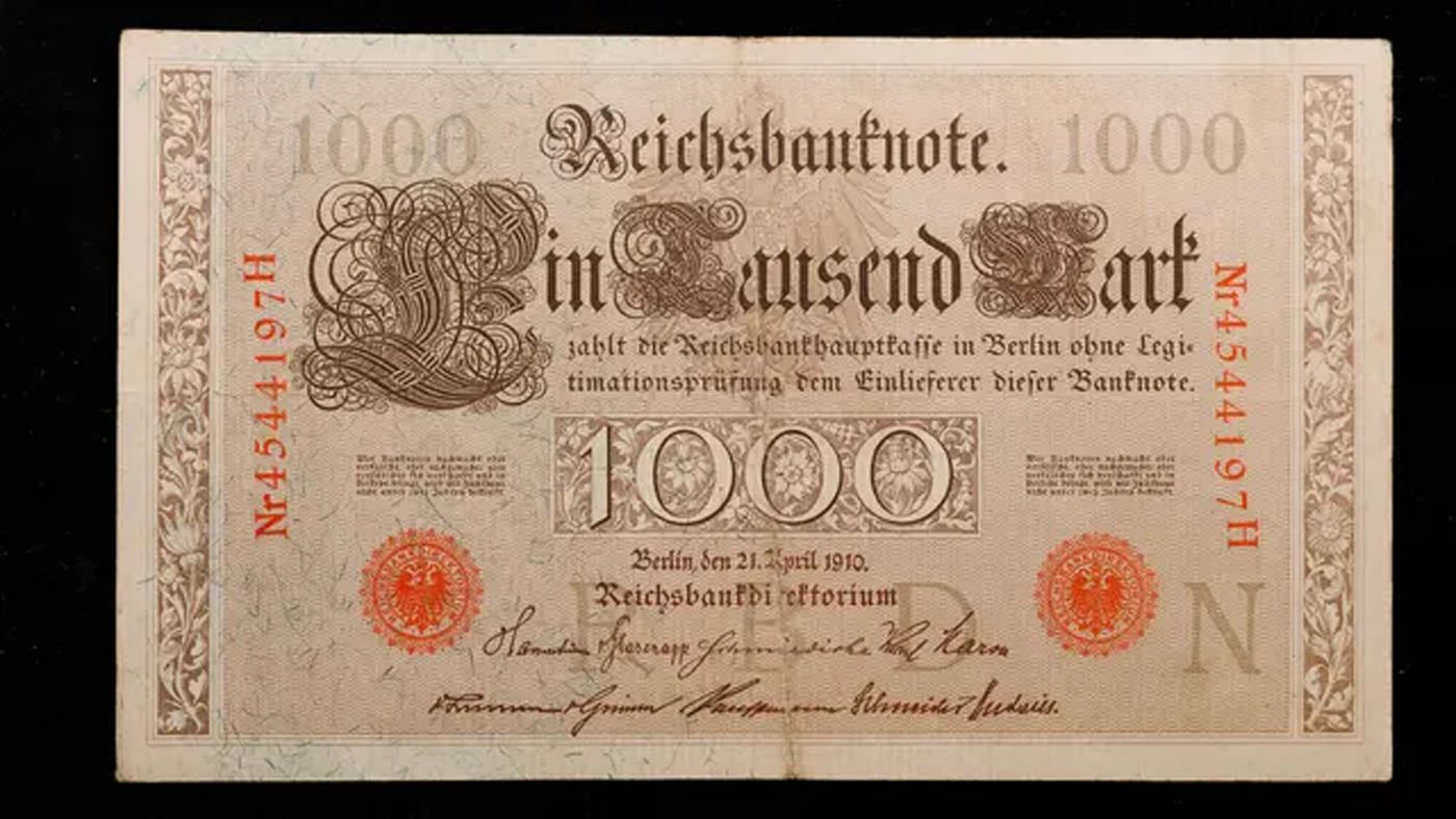 1910 Imperial Germany 1,000 mark Note P# 45A Grades Choice AU/BU Slider. From 1871 to 1914 the German Mark was known as the "Goldmark", as it was on the gold standard. During WWI, like most nations, Germany removed the gold backing and ceased circulation of gold coins. The Goldmark was the culmination of years of effort put into unifying the currency of Germany.