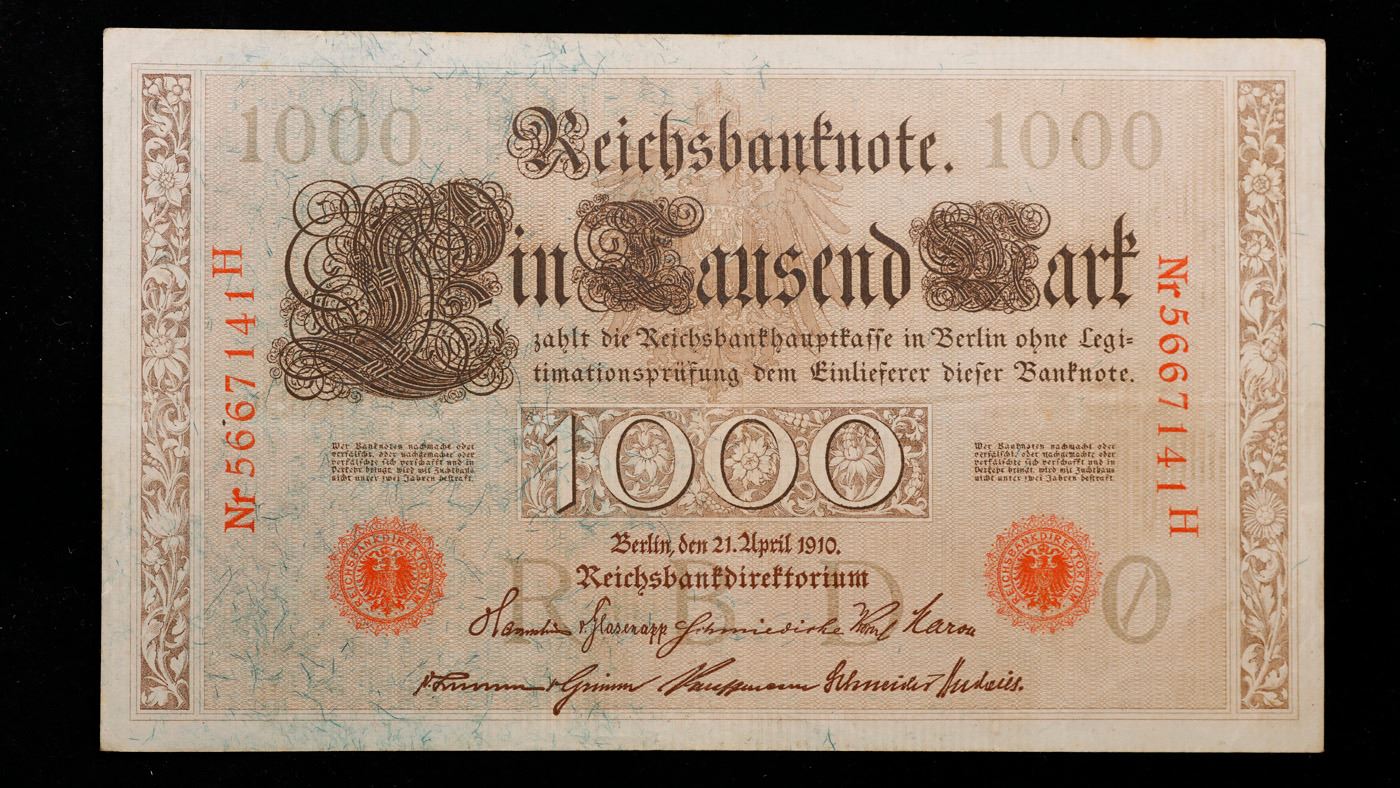1910 Imperial Germany 1,000 mark Note P# 45B Grades Choice AU/BU Slider. From 1871 to 1914 the German Mark was known as the "Goldmark", as it was on the gold standard. During WWI, like most nations, Germany removed the gold backing and ceased circulation of gold coins. The Goldmark was the culmination of years of effort put into unifying the currency of Germany.