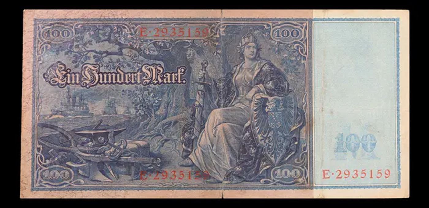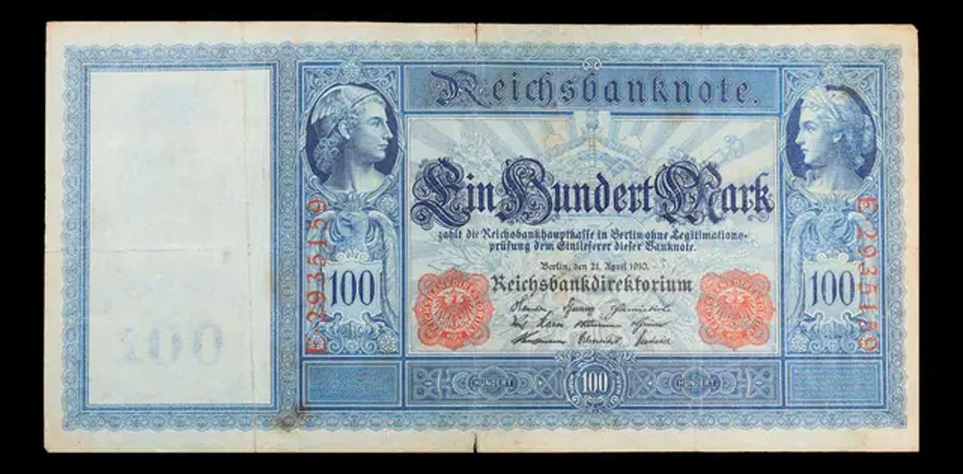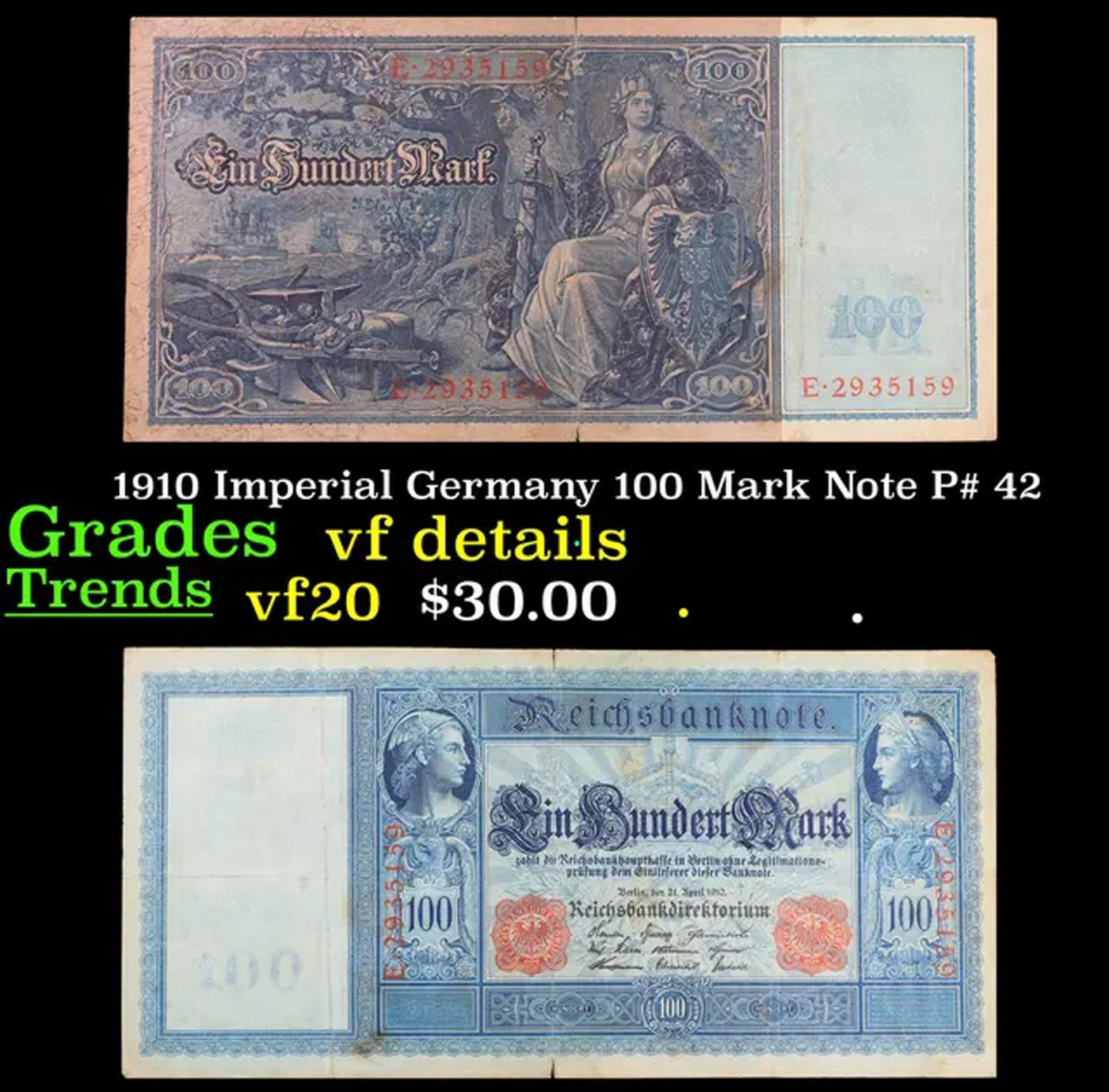 1910 Imperial Germany 100 Mark Note P# 42 Grades vf details. From 1871 to 1914 the German Mark was known as the "Goldmark", as it was on the gold standard. During WWI, like most nations, Germany removed the gold backing and ceased circulation of gold coins. The Goldmark was the culmination of years of effort put into unifying the currency of Germany.