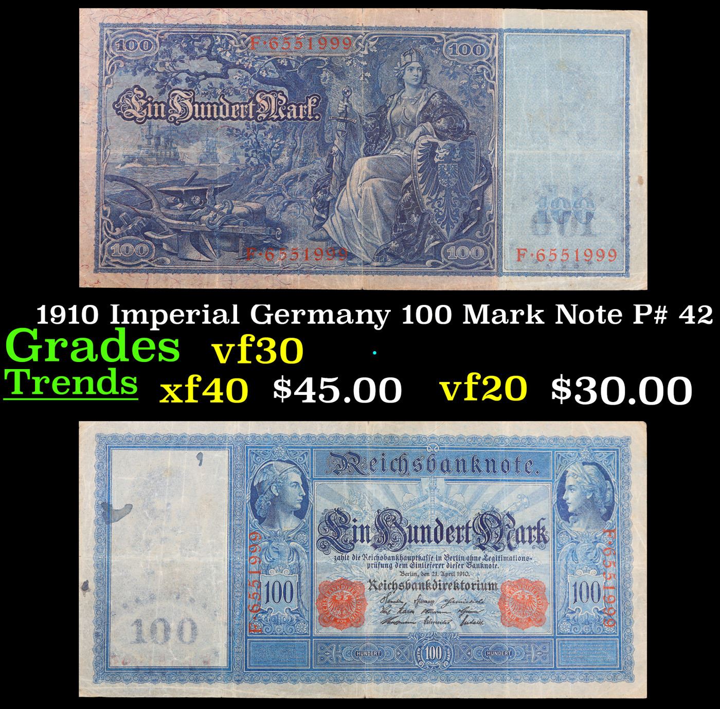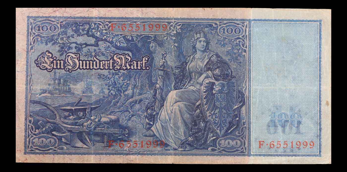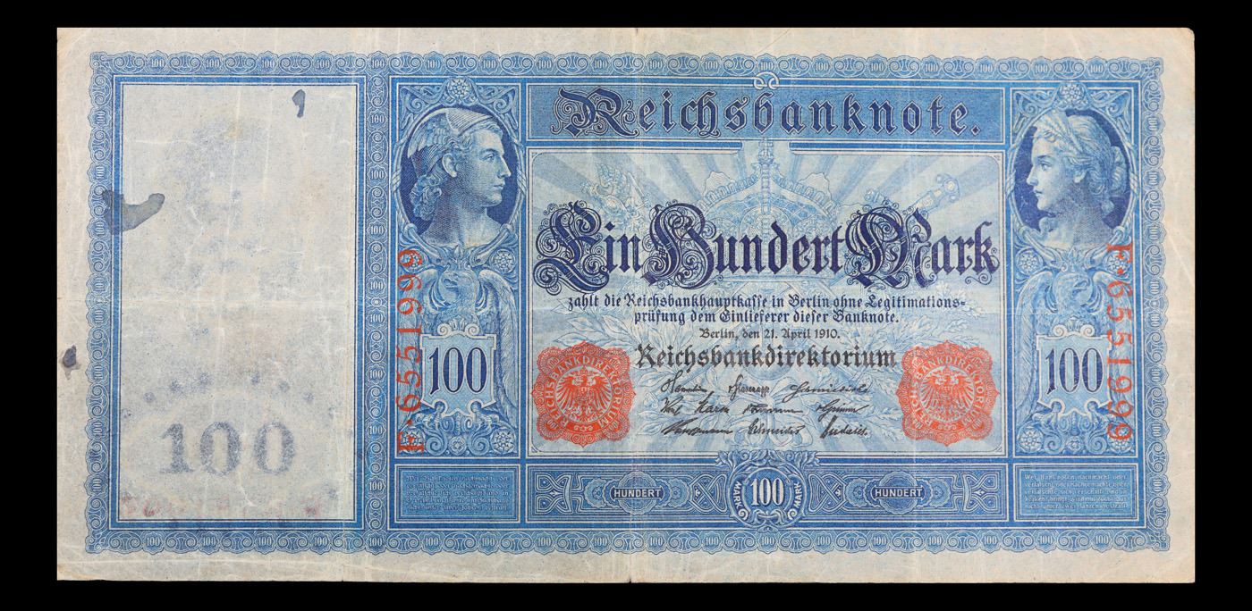 1910 Imperial Germany 100 Mark Note P# 42 Grades vf++. From 1871 to 1914 the German Mark was known as the "Goldmark", as it was on the gold standard. During WWI, like most nations, Germany removed the gold backing and ceased circulation of gold coins. The Goldmark was the culmination of years of effort put into unifying the currency of Germany.