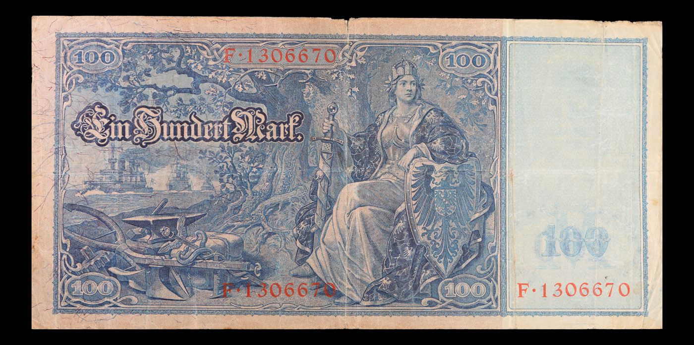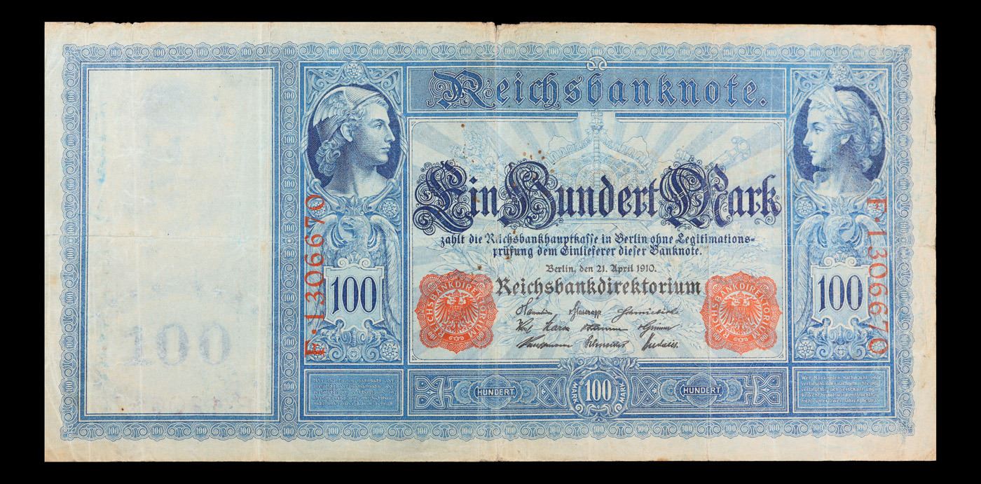 1910 Imperial Germany 100 Mark Note P# 42 Grades vf++. From 1871 to 1914 the German Mark was known as the "Goldmark", as it was on the gold standard. During WWI, like most nations, Germany removed the gold backing and ceased circulation of gold coins. The Goldmark was the culmination of years of effort put into unifying the currency of Germany.