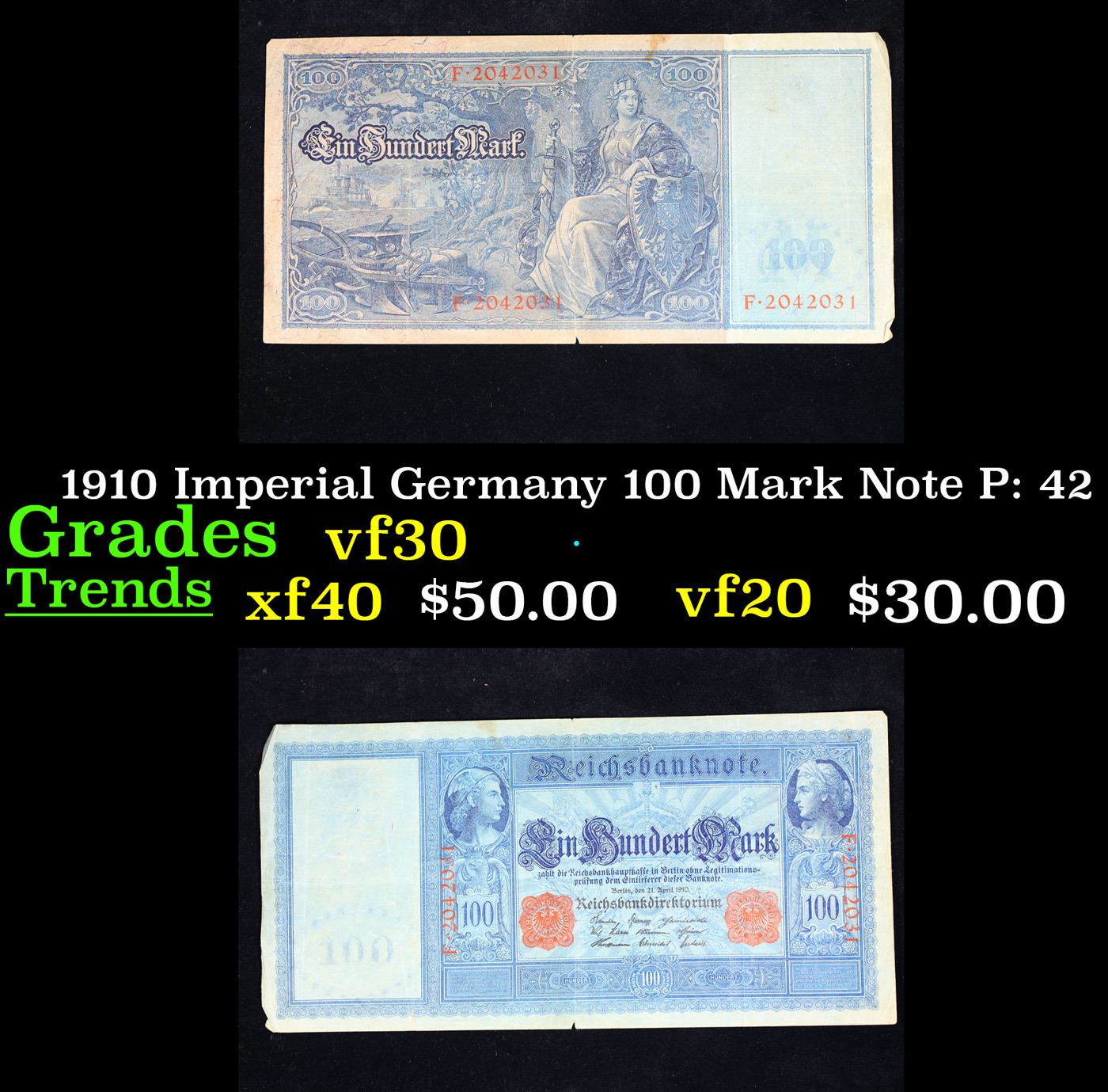 1910 Imperial Germany 100 Mark Note P# 42 Grades vf++. From 1871 to 1914 the German Mark was known as the "Goldmark", as it was on the gold standard. During WWI, like most nations, Germany removed the gold backing and ceased circulation of gold coins. The Goldmark was the culmination of years of effort put into unifying the currency of Germany.