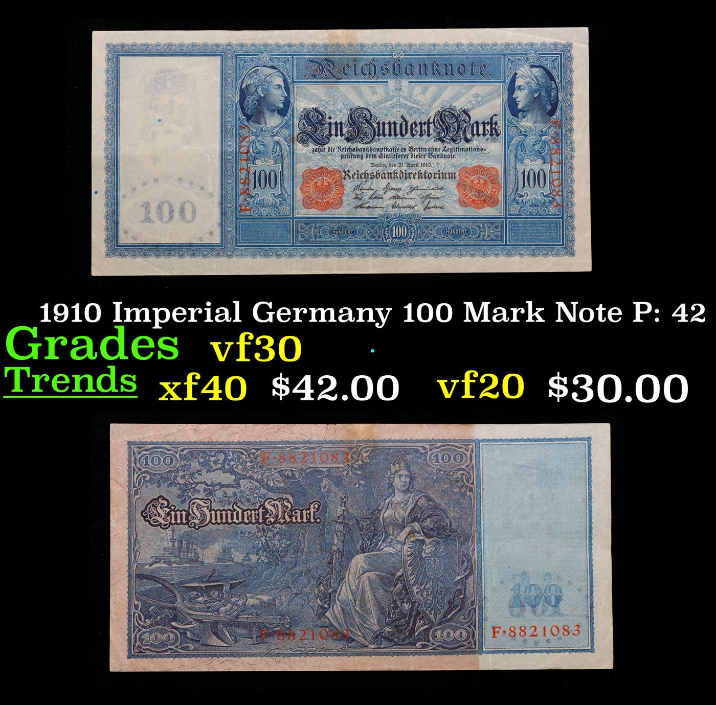 1910 Imperial Germany 100 Mark Note P: 42 Grades vf++. From 1871 to 1914 the German Mark was known as the "Goldmark", as it was on the gold standard. During WWI, like most nations, Germany removed the gold backing and ceased circulation of gold coins. The Goldmark was the culmination of years of effort put into unifying the currency of Germany.