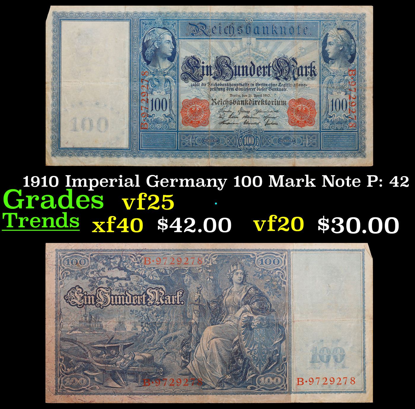 1910 Imperial Germany 100 Mark Note P: 42 Grades vf+. From 1871 to 1914 the German Mark was known as the "Goldmark", as it was on the gold standard. During WWI, like most nations, Germany removed the gold backing and ceased circulation of gold coins. The Goldmark was the culmination of years of effort put into unifying the currency of Germany.