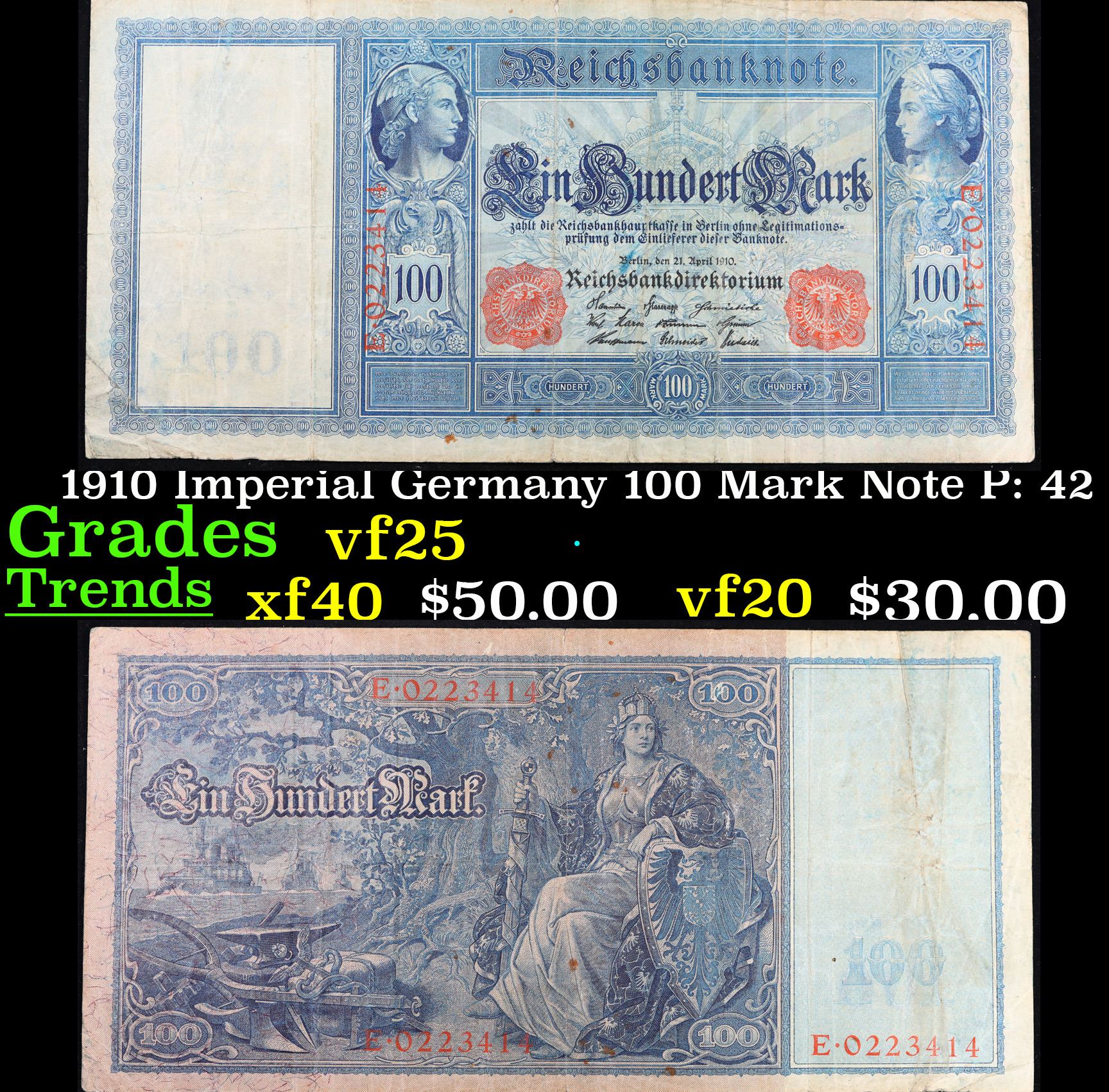 1910 Imperial Germany 100 Mark Note P: 42 Grades vf+.