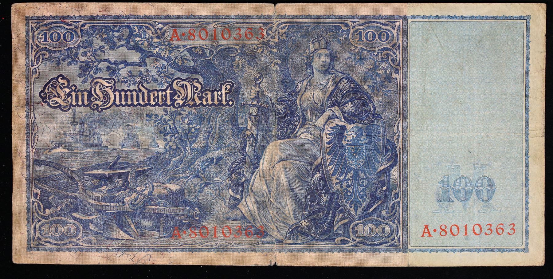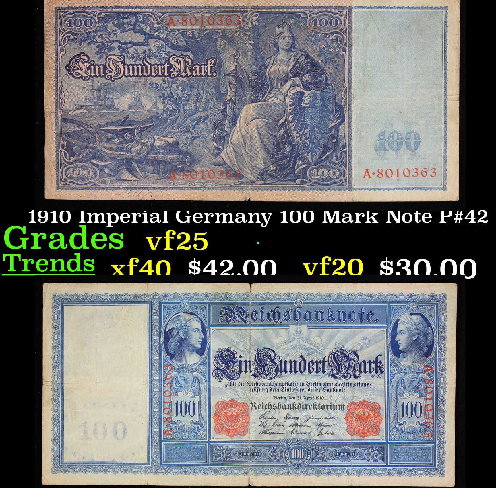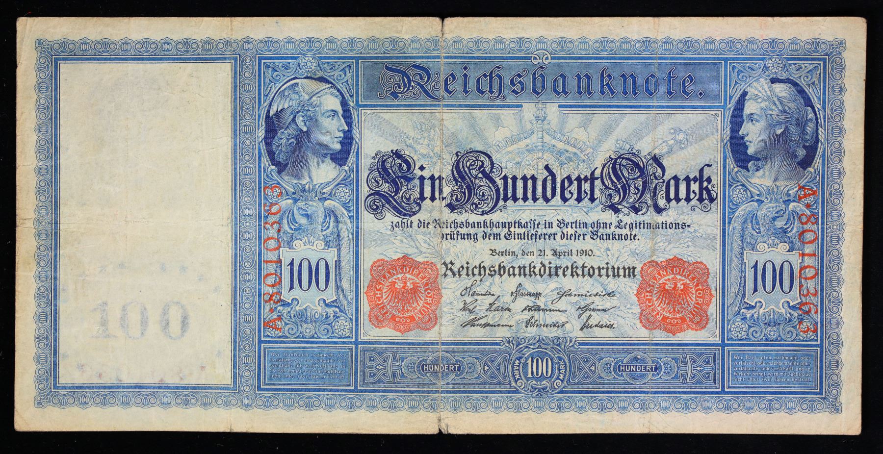 1910 Imperial Germany 100 Mark Note P#42 Grades vf+. From 1871 to 1914 the German Mark was known as the "Goldmark", as it was on the gold standard. During WWI, like most nations, Germany removed the gold backing and ceased circulation of gold coins. The Goldmark was the culmination of years of effort put into unifying the currency of Germany.