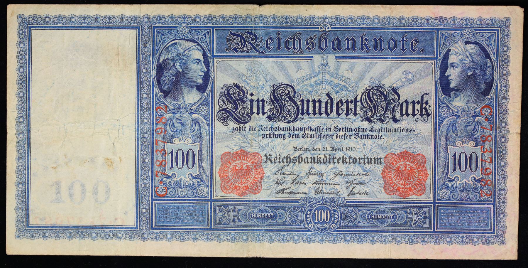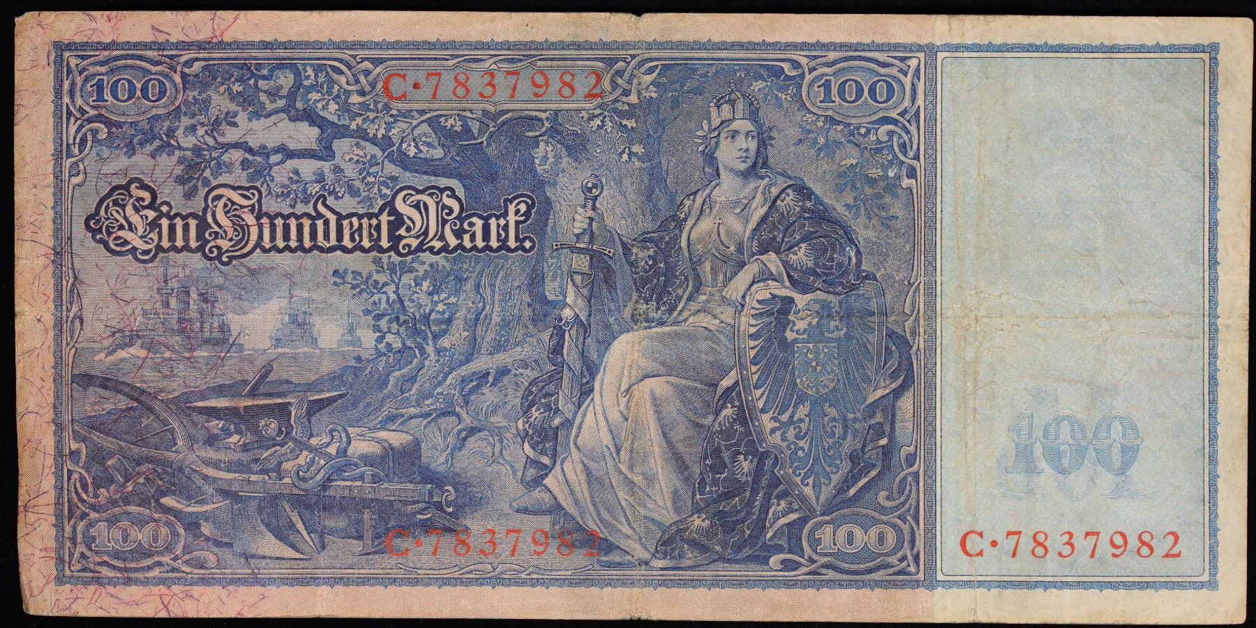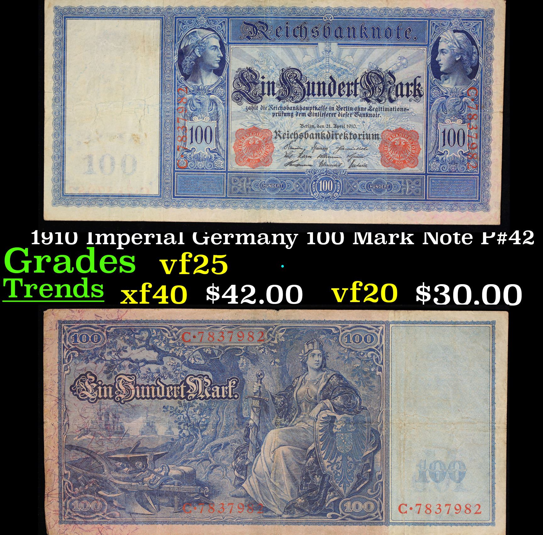 1910 Imperial Germany 100 Mark Note P#42 Grades vf+. From 1871 to 1914 the German Mark was known as the "Goldmark", as it was on the gold standard. During WWI, like most nations, Germany removed the gold backing and ceased circulation of gold coins. The Goldmark was the culmination of years of effort put into unifying the currency of Germany.