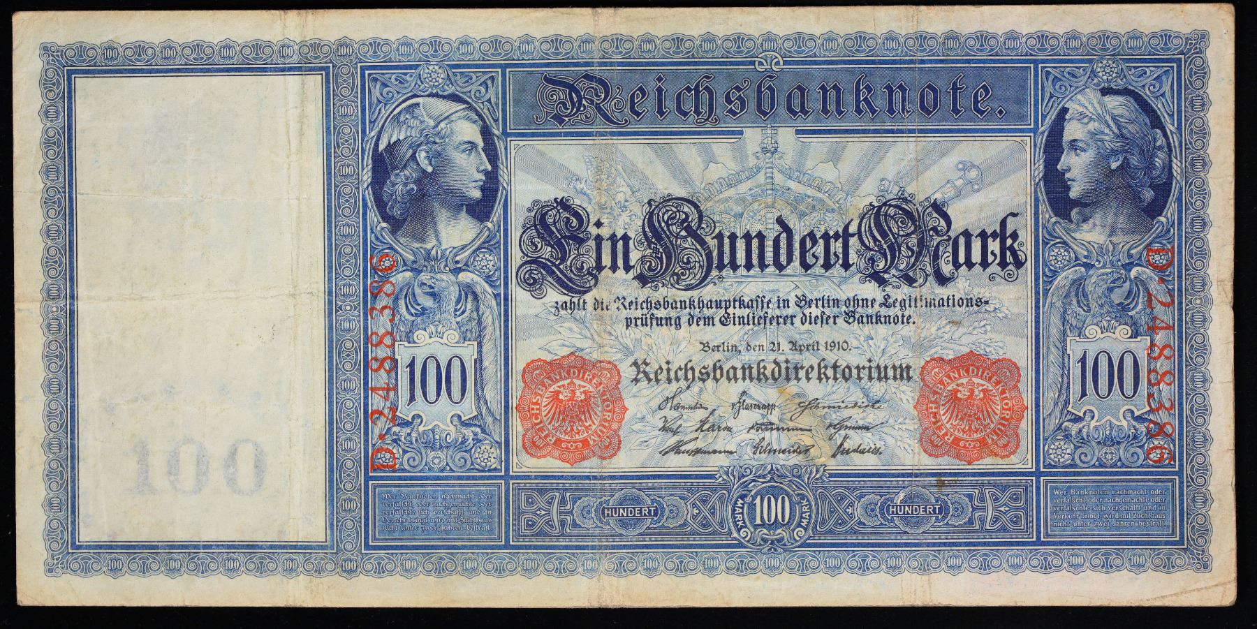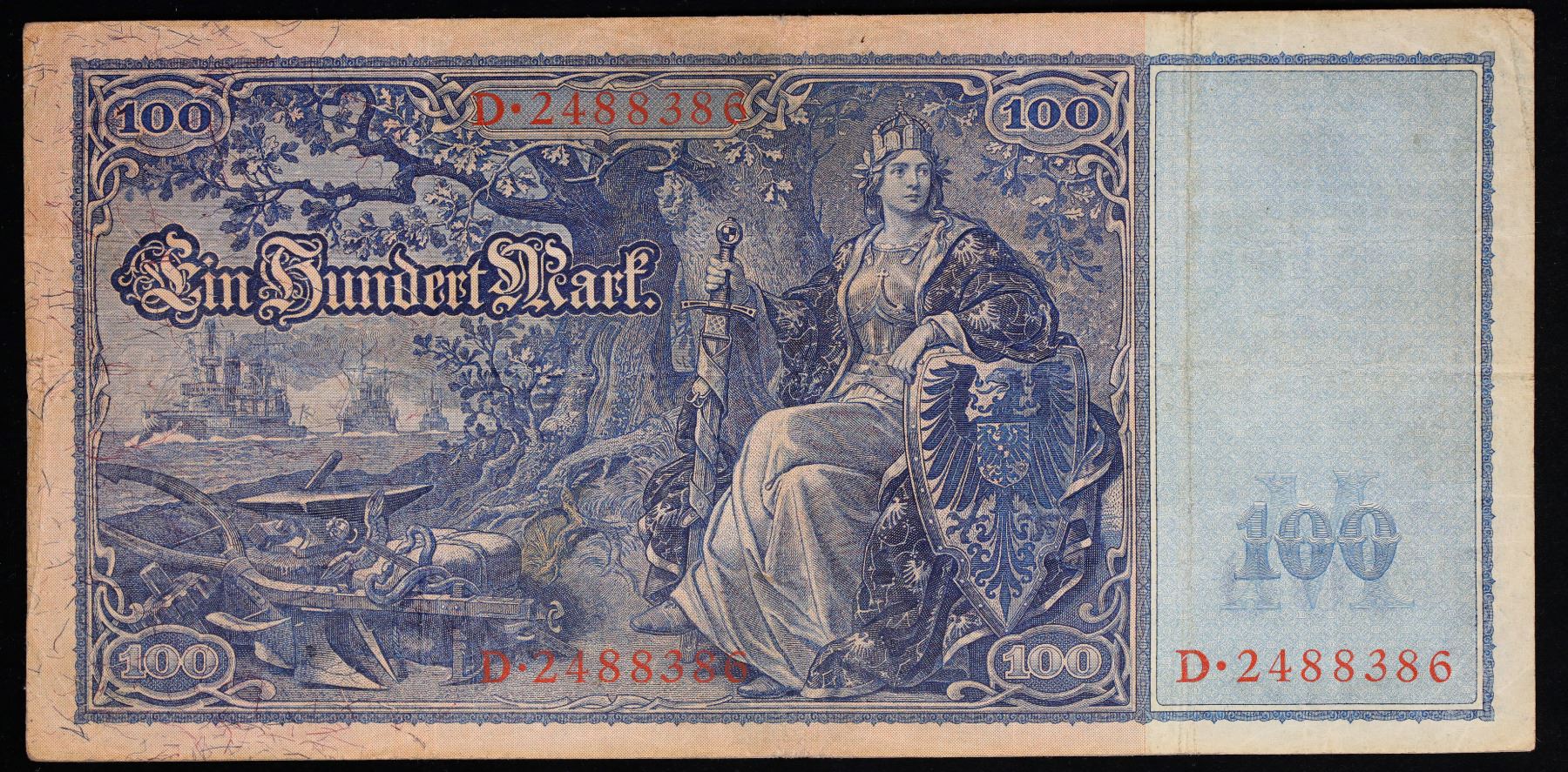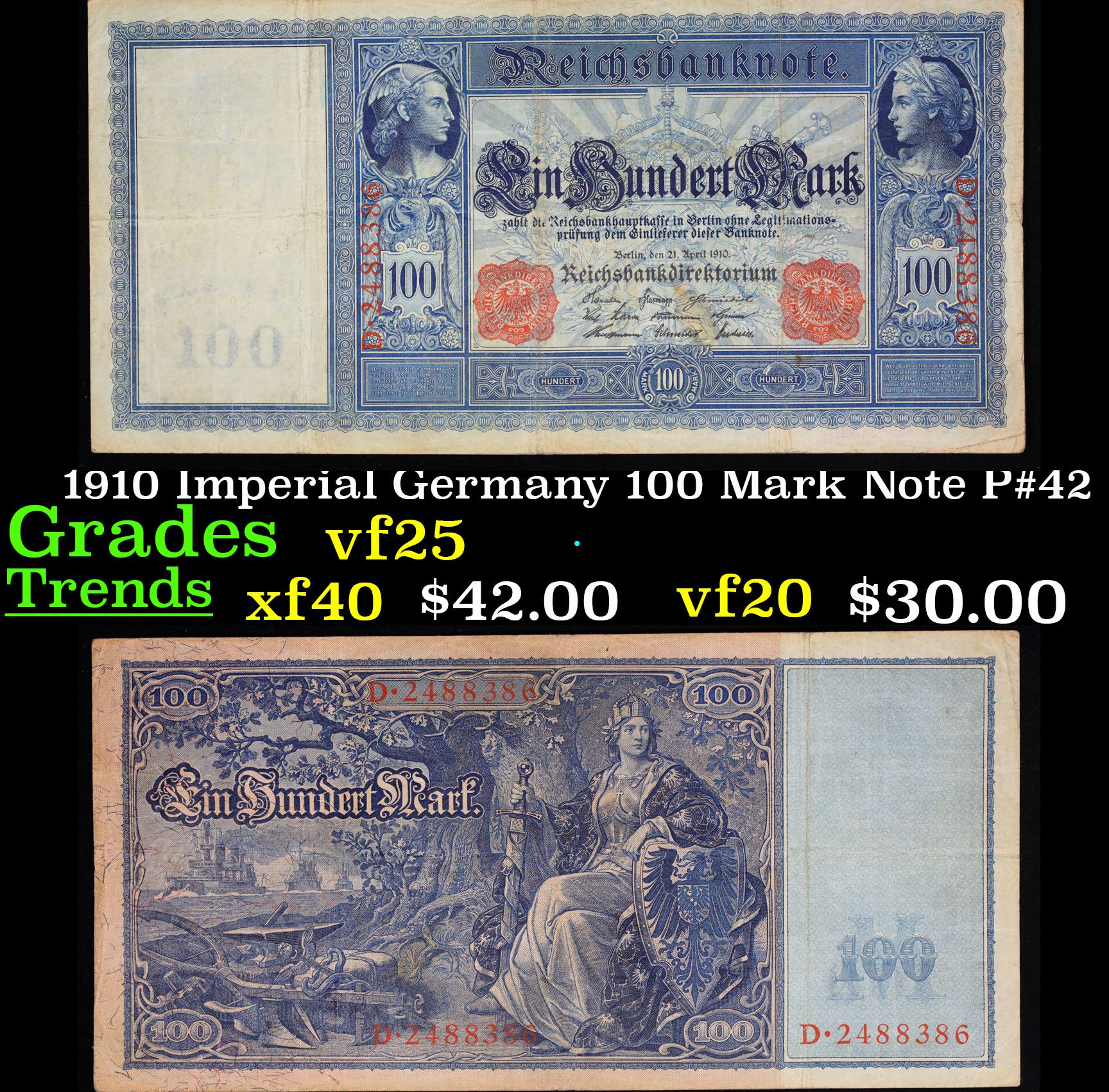 1910 Imperial Germany 100 Mark Note P#42 Grades vf+. From 1871 to 1914 the German Mark was known as the "Goldmark", as it was on the gold standard. During WWI, like most nations, Germany removed the gold backing and ceased circulation of gold coins. The Goldmark was the culmination of years of effort put into unifying the currency of Germany.