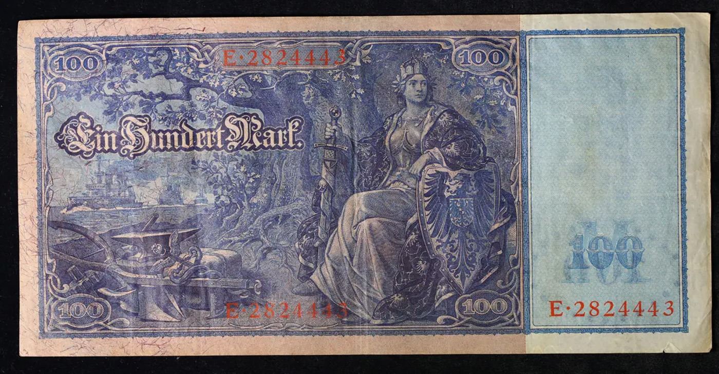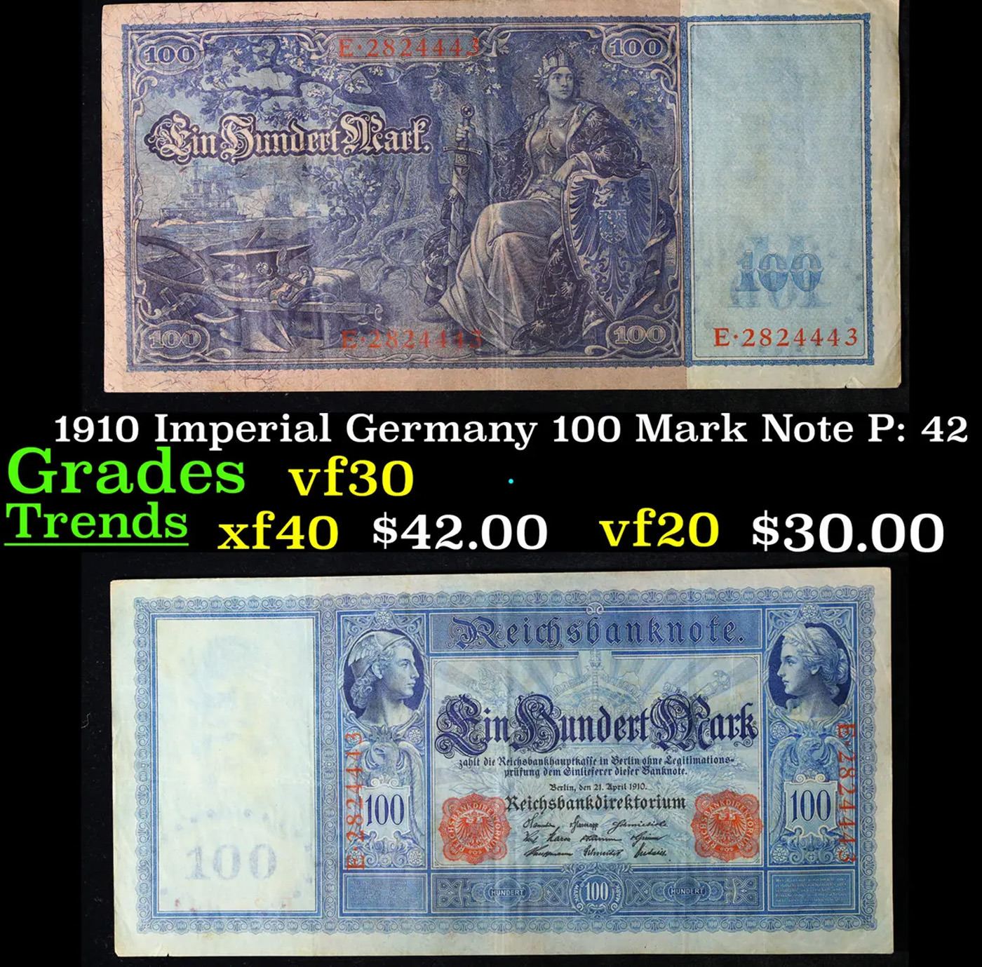 1910 Imperial Germany 100 Mark Note P: 42 Grades vf++. From 1871 to 1914 the German Mark was known as the "Goldmark", as it was on the gold standard. During WWI, like most nations, Germany removed the gold backing and ceased circulation of gold coins. The Goldmark was the culmination of years of effort put into unifying the currency of Germany.