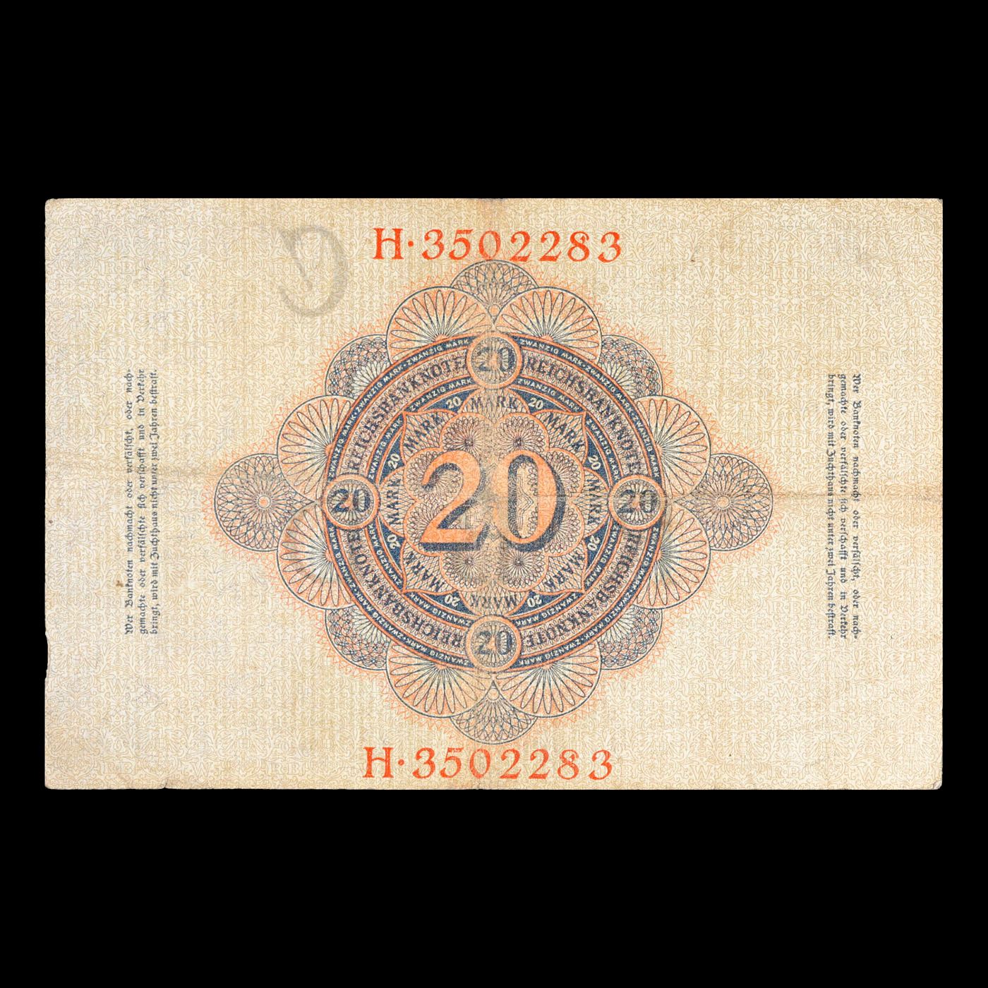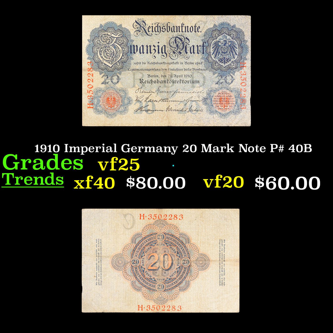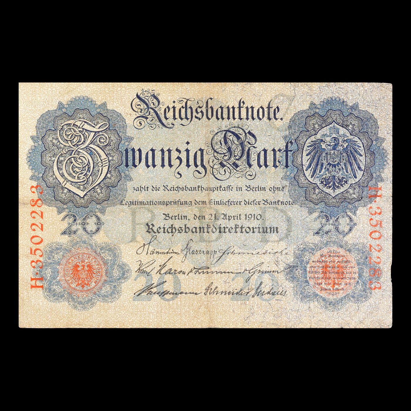 1910 Imperial Germany 20 Mark Note P# 40B Grades vf+.