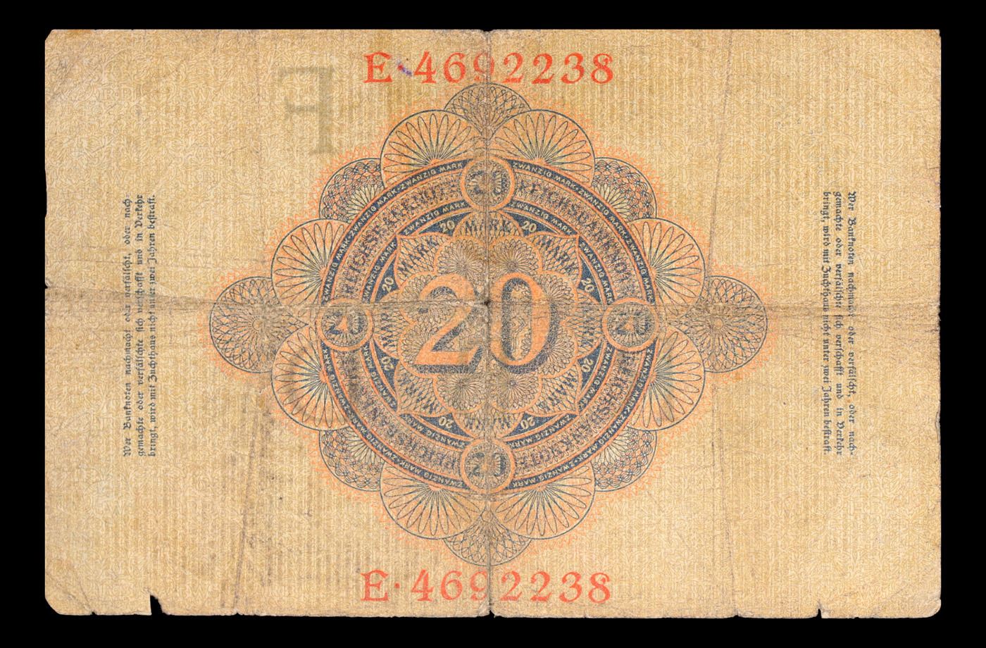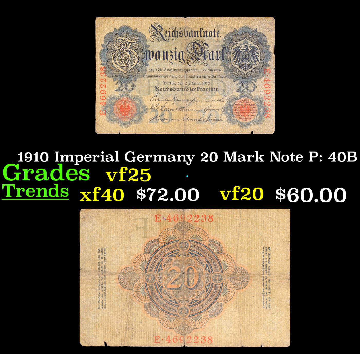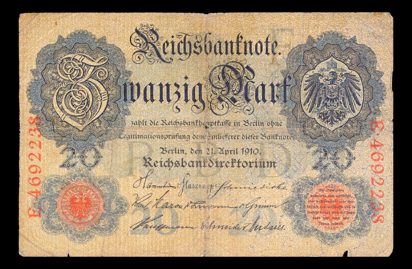 1910 Imperial Germany 20 Mark Note P: 40B Grades vf+. From 1871 to 1914 the German Mark was known as the "Goldmark", as it was on the gold standard. During WWI, like most nations, Germany removed the gold backing and ceased circulation of gold coins. The Goldmark was the culmination of years of effort put into unifying the currency of Germany.