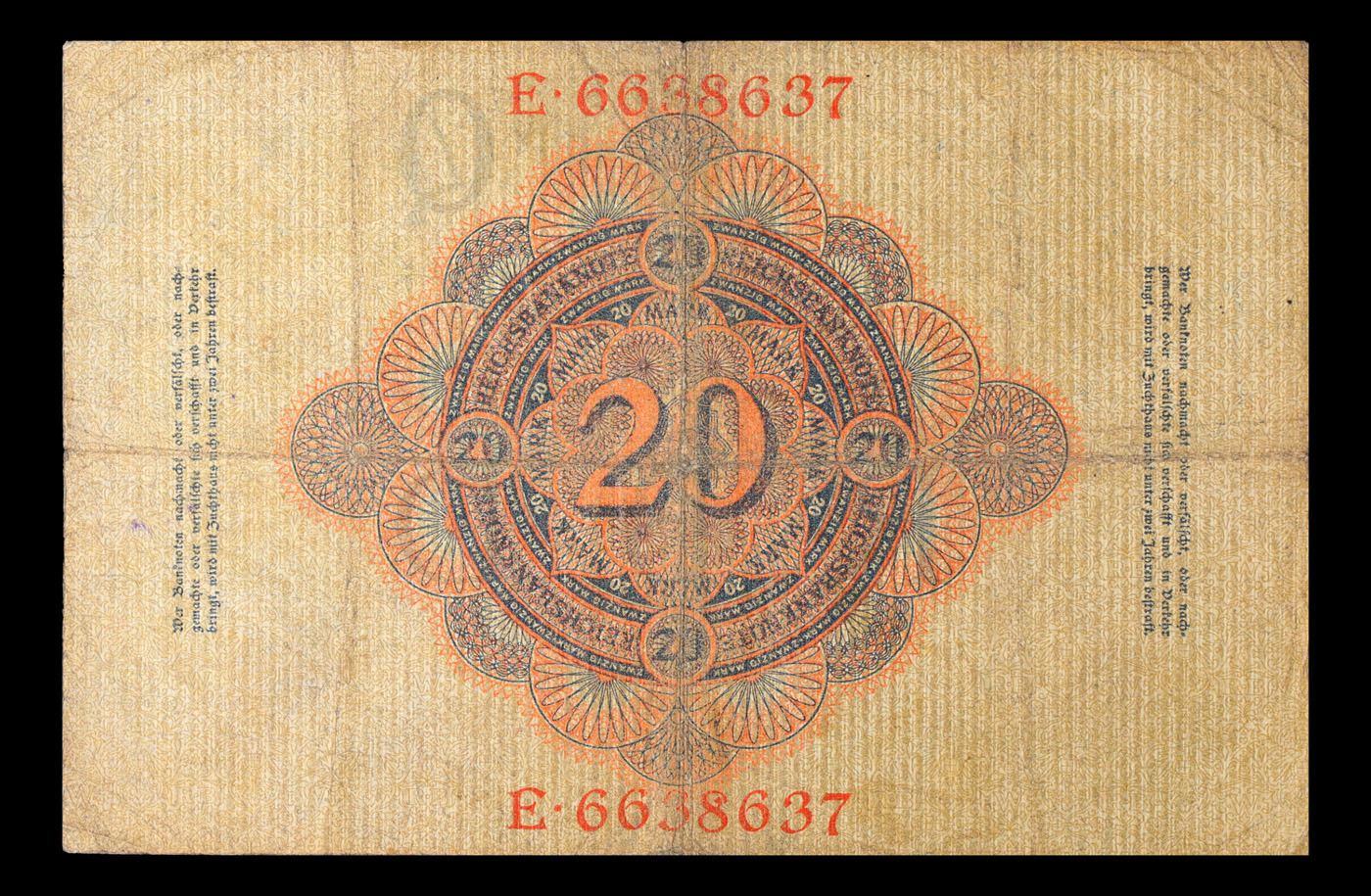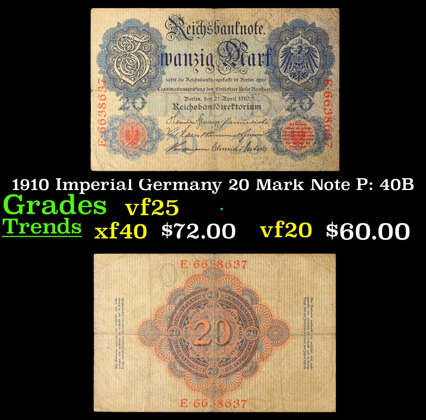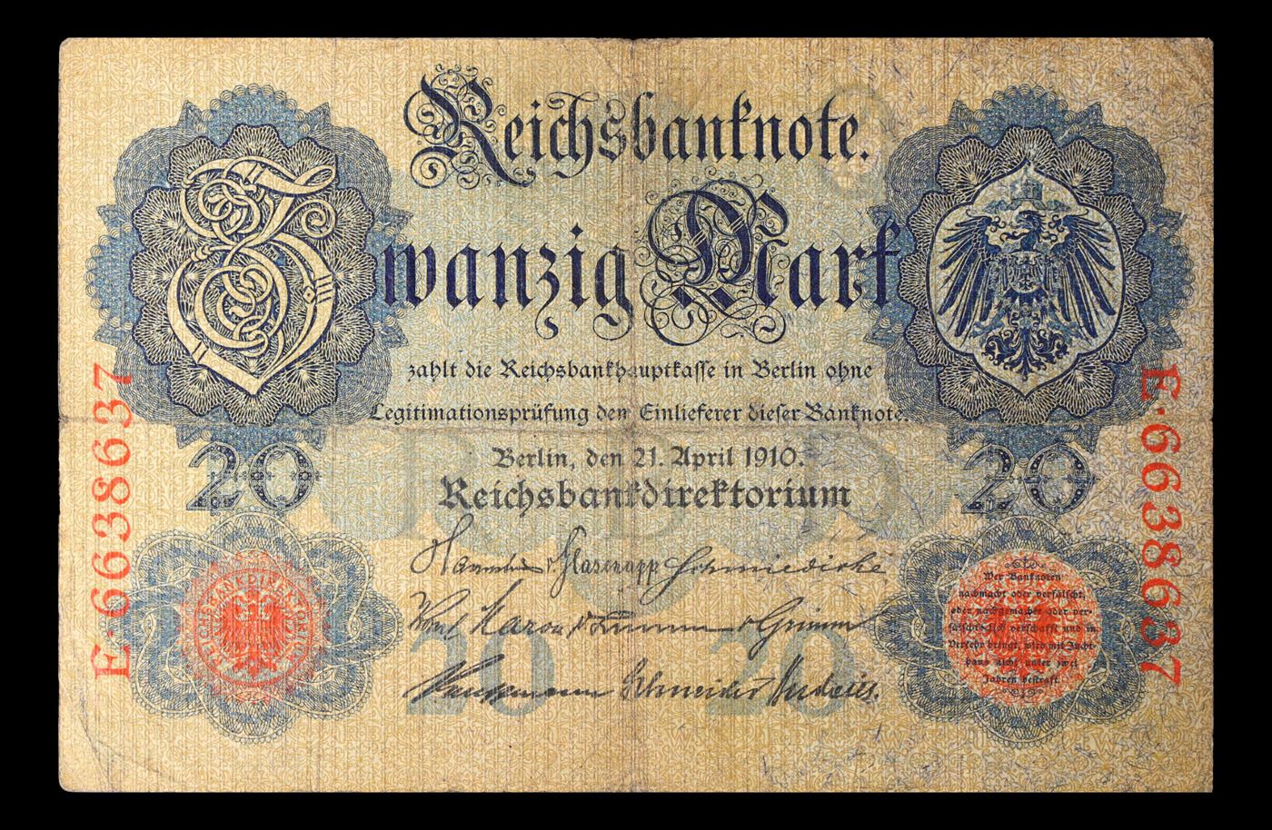 1910 Imperial Germany 20 Mark Note P: 40B Grades vf+. From 1871 to 1914 the German Mark was known as the "Goldmark", as it was on the gold standard. During WWI, like most nations, Germany removed the gold backing and ceased circulation of gold coins. The Goldmark was the culmination of years of effort put into unifying the currency of Germany.