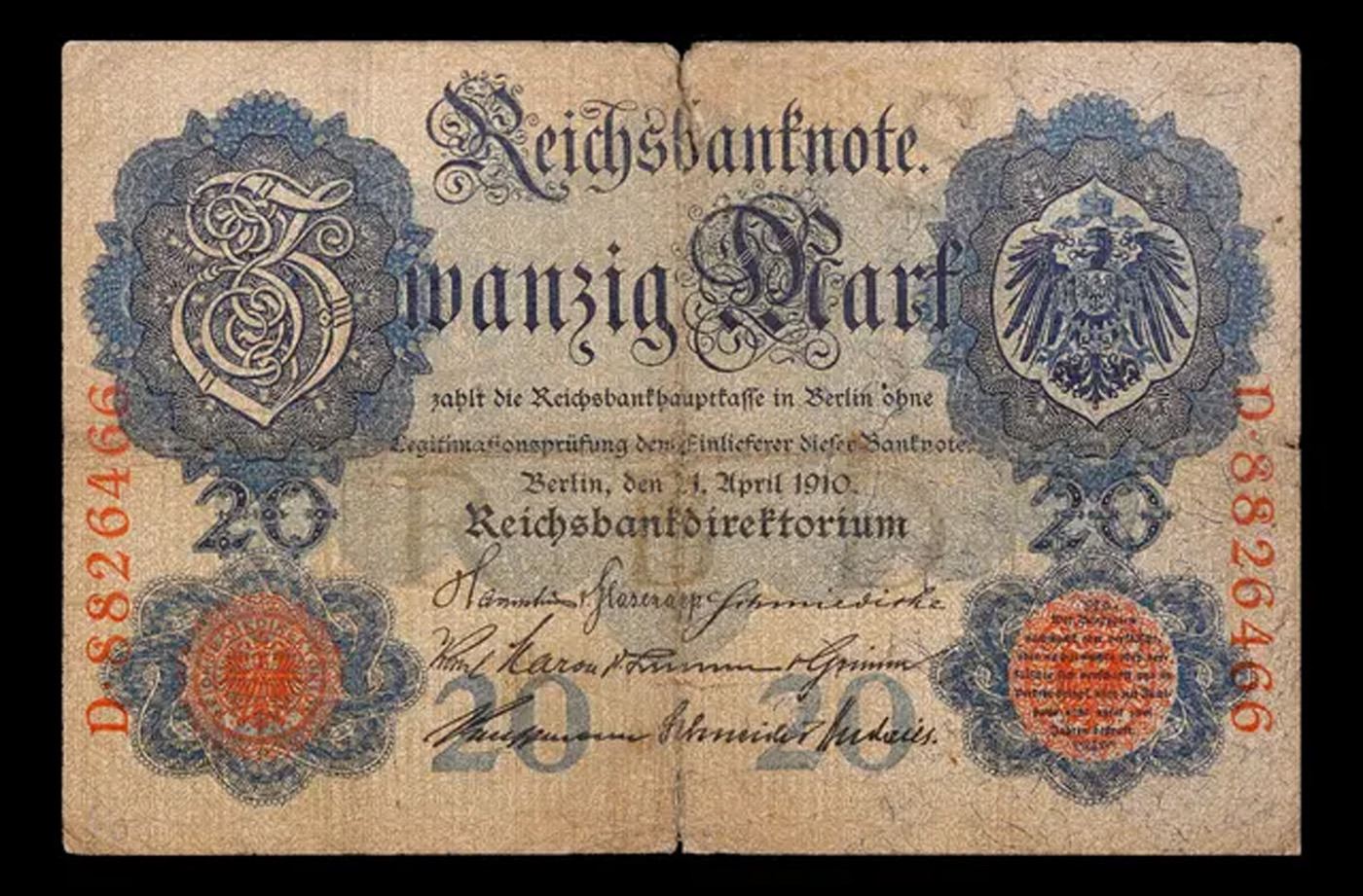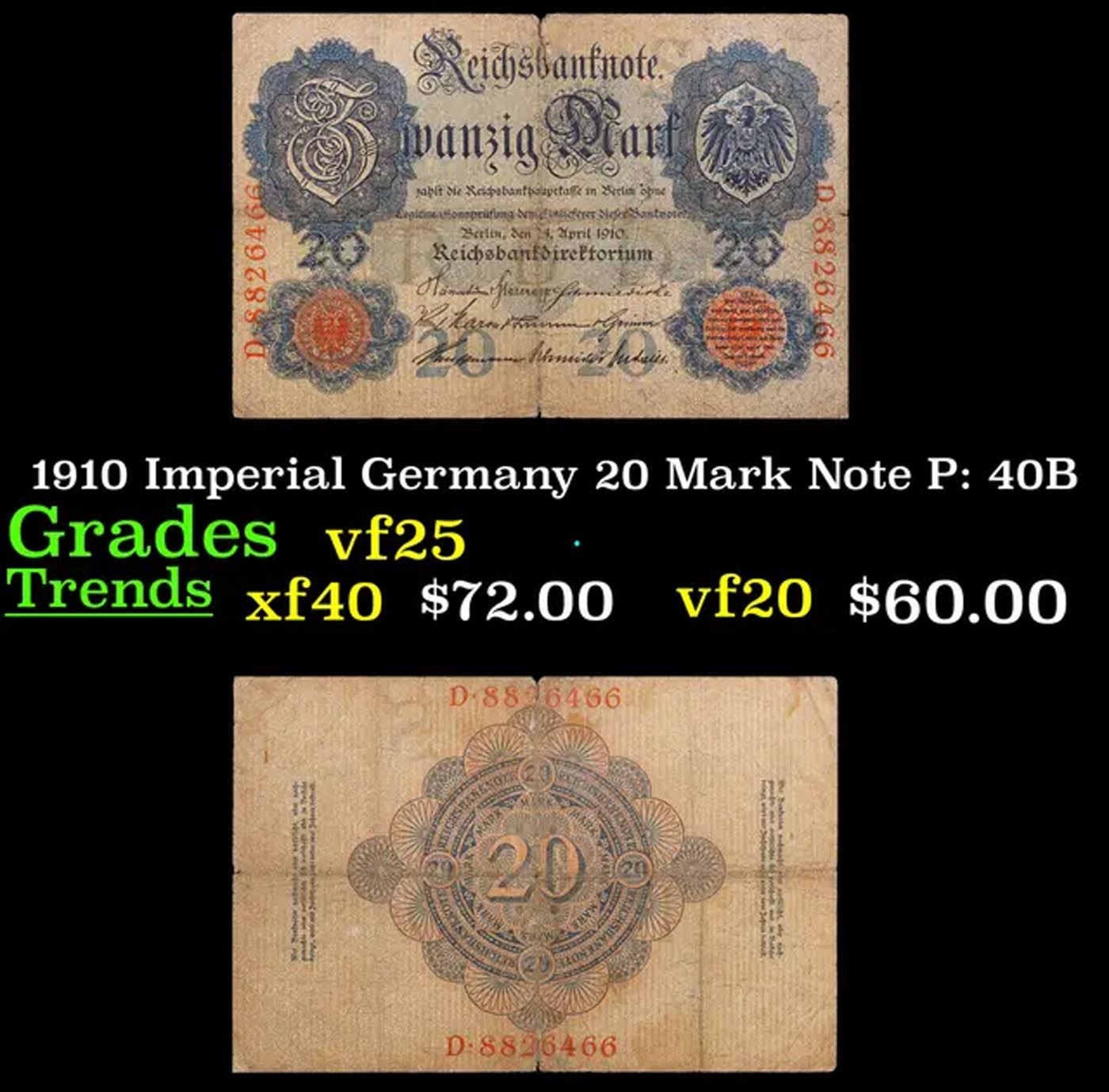 1910 Imperial Germany 20 Mark Note P: 40B Grades vf+. From 1871 to 1914 the German Mark was known as the "Goldmark", as it was on the gold standard. During WWI, like most nations, Germany removed the gold backing and ceased circulation of gold coins. The Goldmark was the culmination of years of effort put into unifying the currency of Germany.