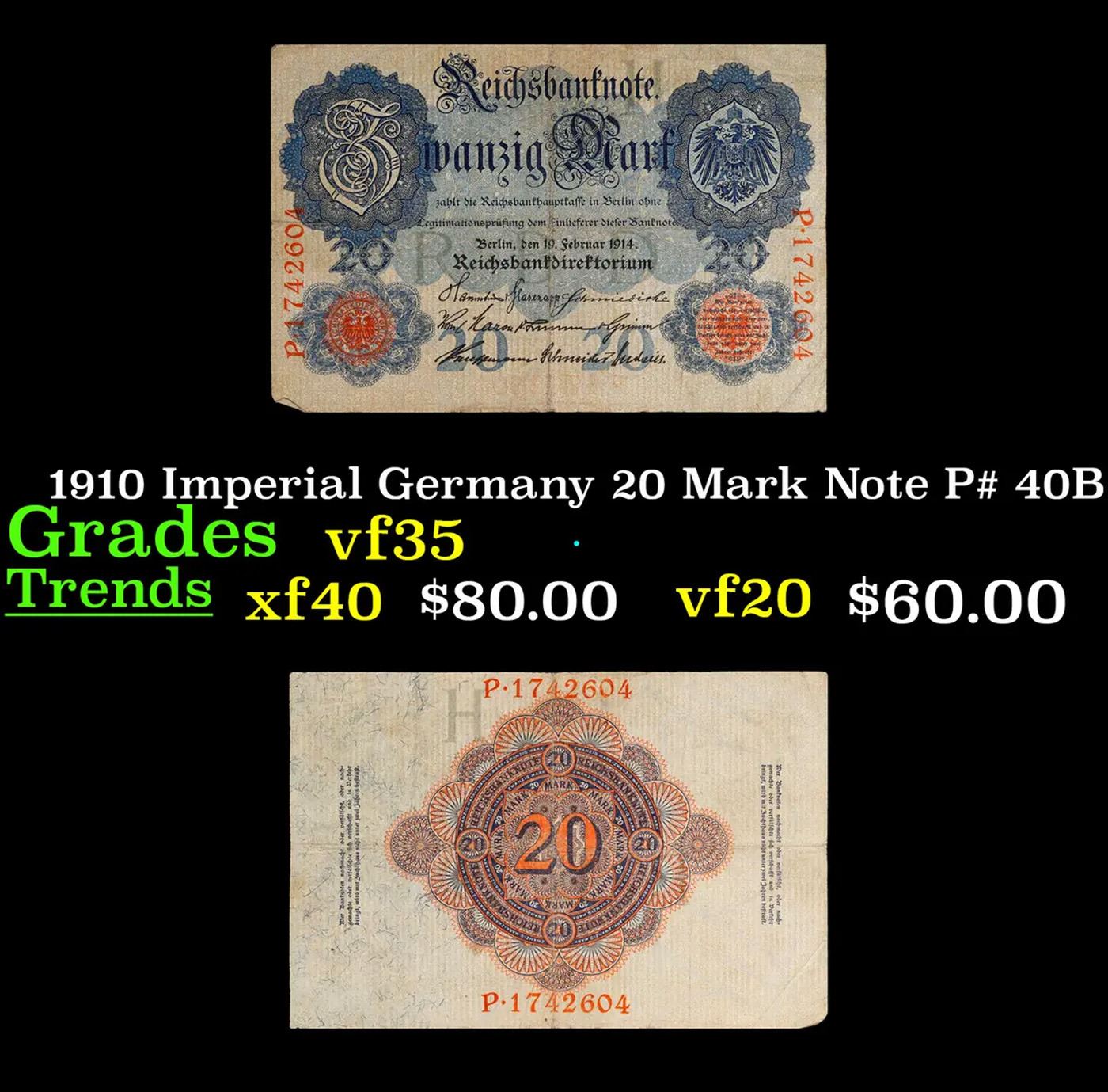 1910 Imperial Germany 20 Mark Note P# 40B Grades vf++.