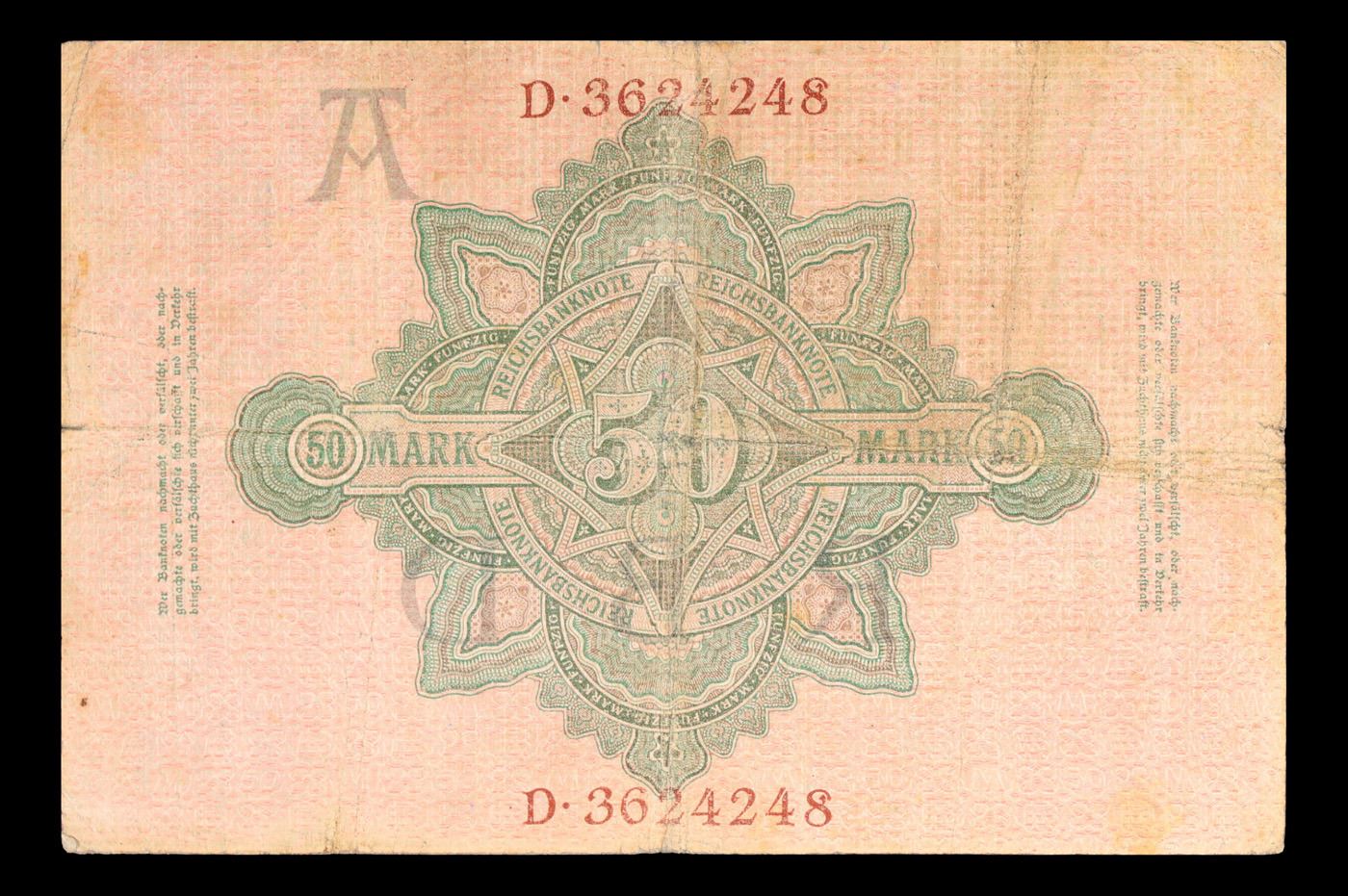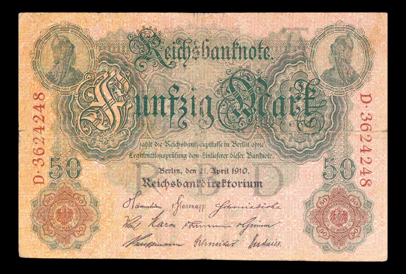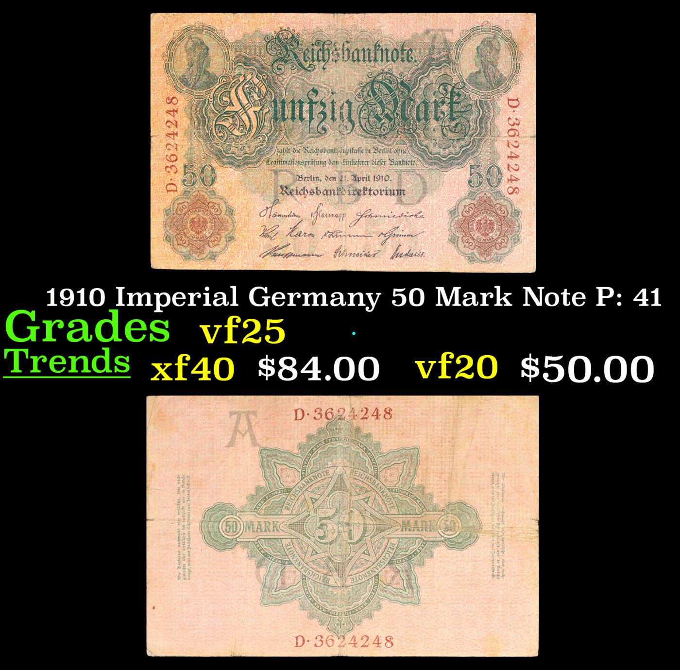 1910 Imperial Germany 50 Mark Note P: 41 Grades vf+. From 1871 to 1914 the German Mark was known as the "Goldmark", as it was on the gold standard. During WWI, like most nations, Germany removed the gold backing and ceased circulation of gold coins. The Goldmark was the culmination of years of effort put into unifying the currency of Germany.