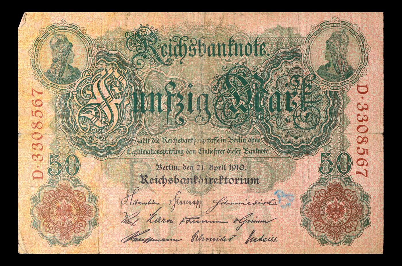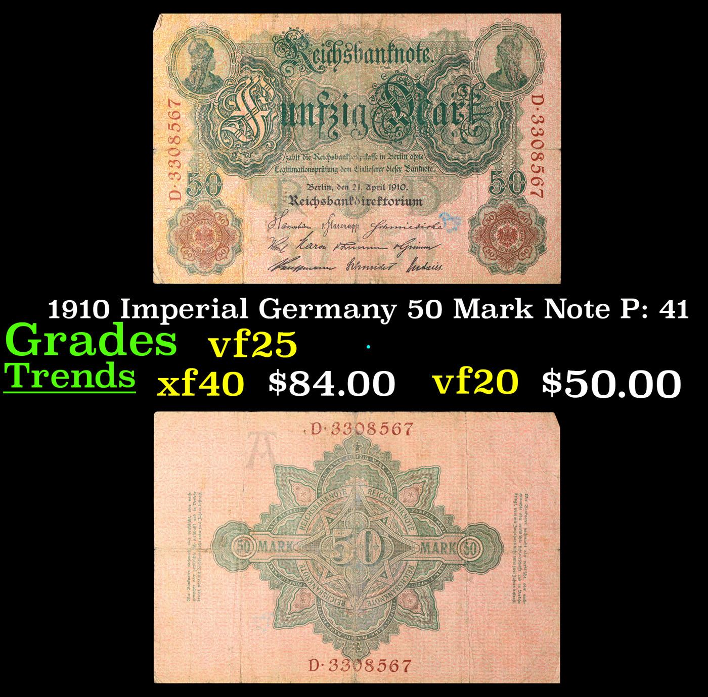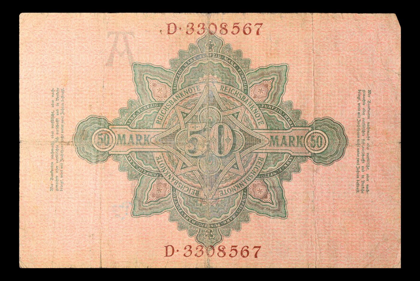 1910 Imperial Germany 50 Mark Note P: 41 Grades vf+. From 1871 to 1914 the German Mark was known as the "Goldmark", as it was on the gold standard. During WWI, like most nations, Germany removed the gold backing and ceased circulation of gold coins. The Goldmark was the culmination of years of effort put into unifying the currency of Germany.