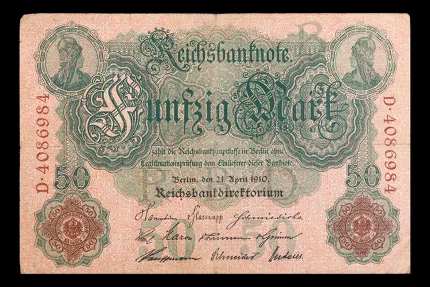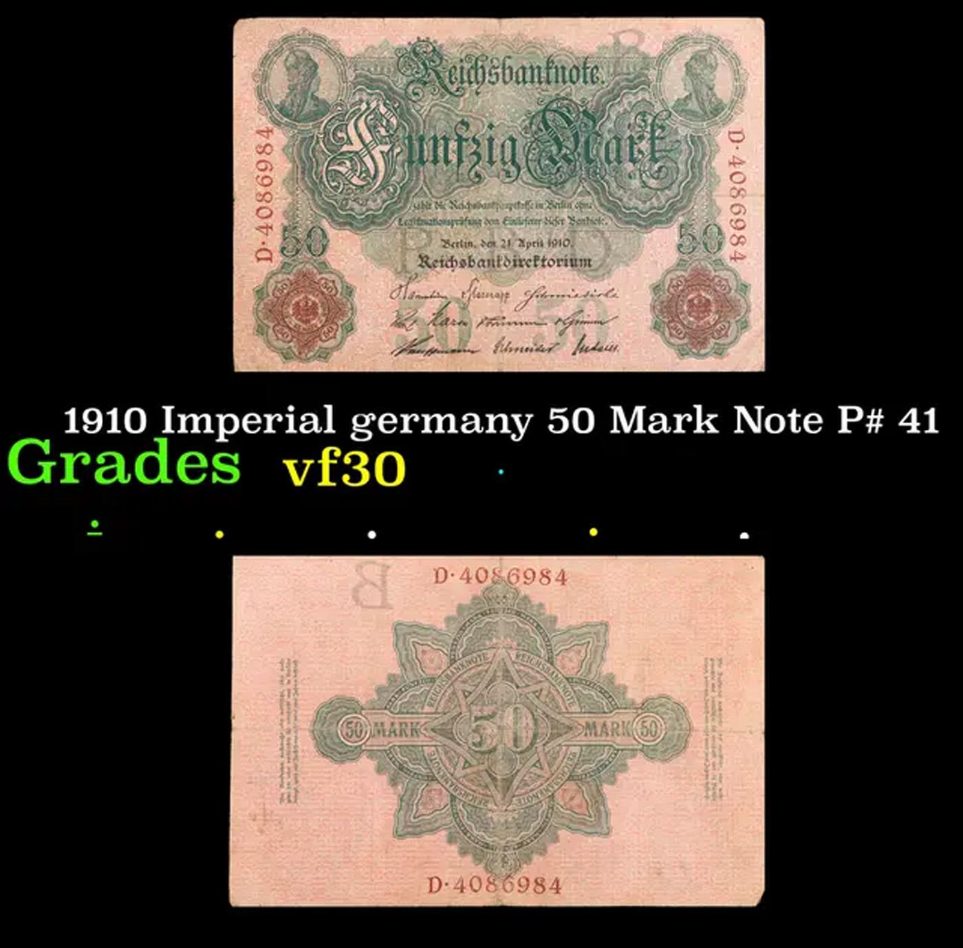 1910 Imperial Germany 50 Mark Note P# 41 Grades vf++. From 1871 to 1914 the German Mark was known as the "Goldmark", as it was on the gold standard. During WWI, like most nations, Germany removed the gold backing and ceased circulation of gold coins. The Goldmark was the culmination of years of effort put into unifying the currency of Germany.