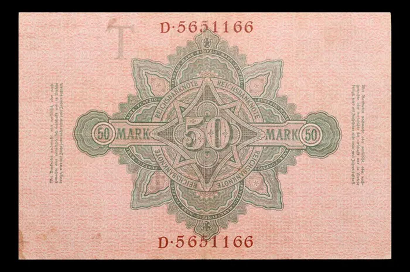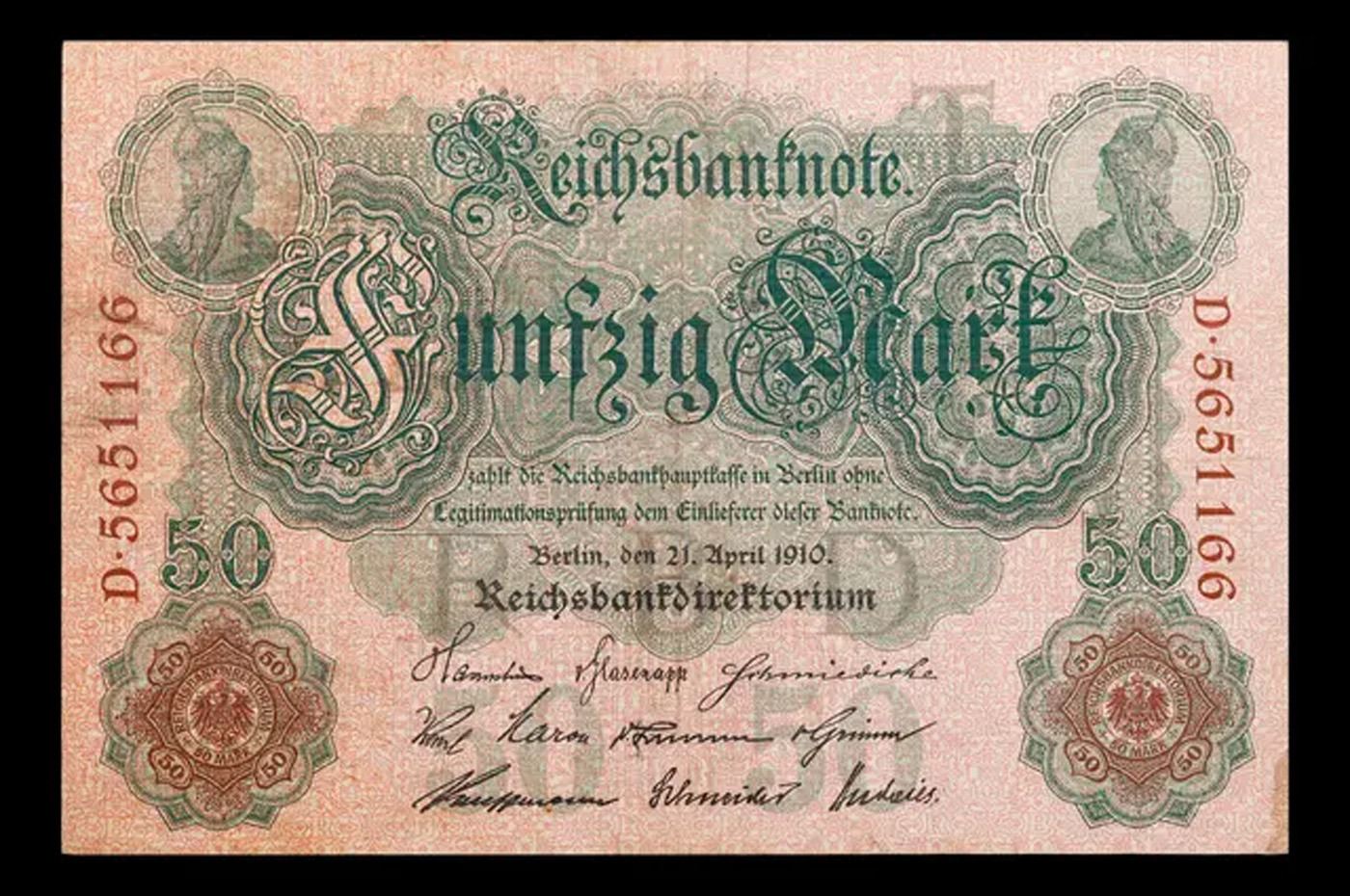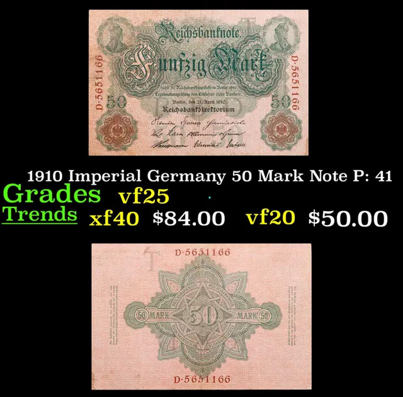 1910 Imperial Germany 50 Mark Note P: 41 Grades vf+. From 1871 to 1914 the German Mark was known as the "Goldmark", as it was on the gold standard. During WWI, like most nations, Germany removed the gold backing and ceased circulation of gold coins. The Goldmark was the culmination of years of effort put into unifying the currency of Germany.