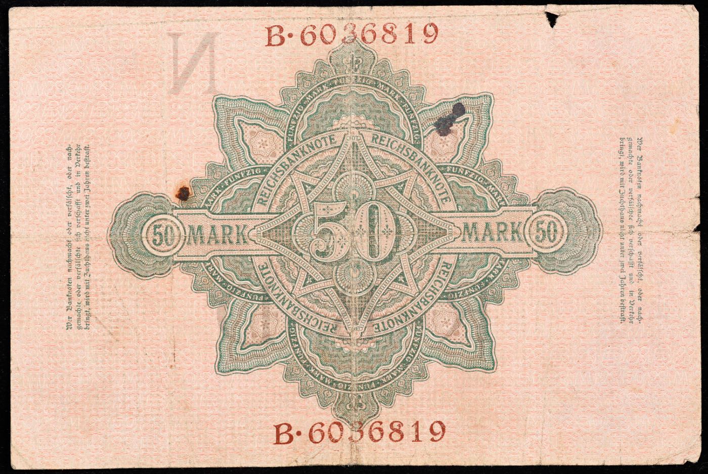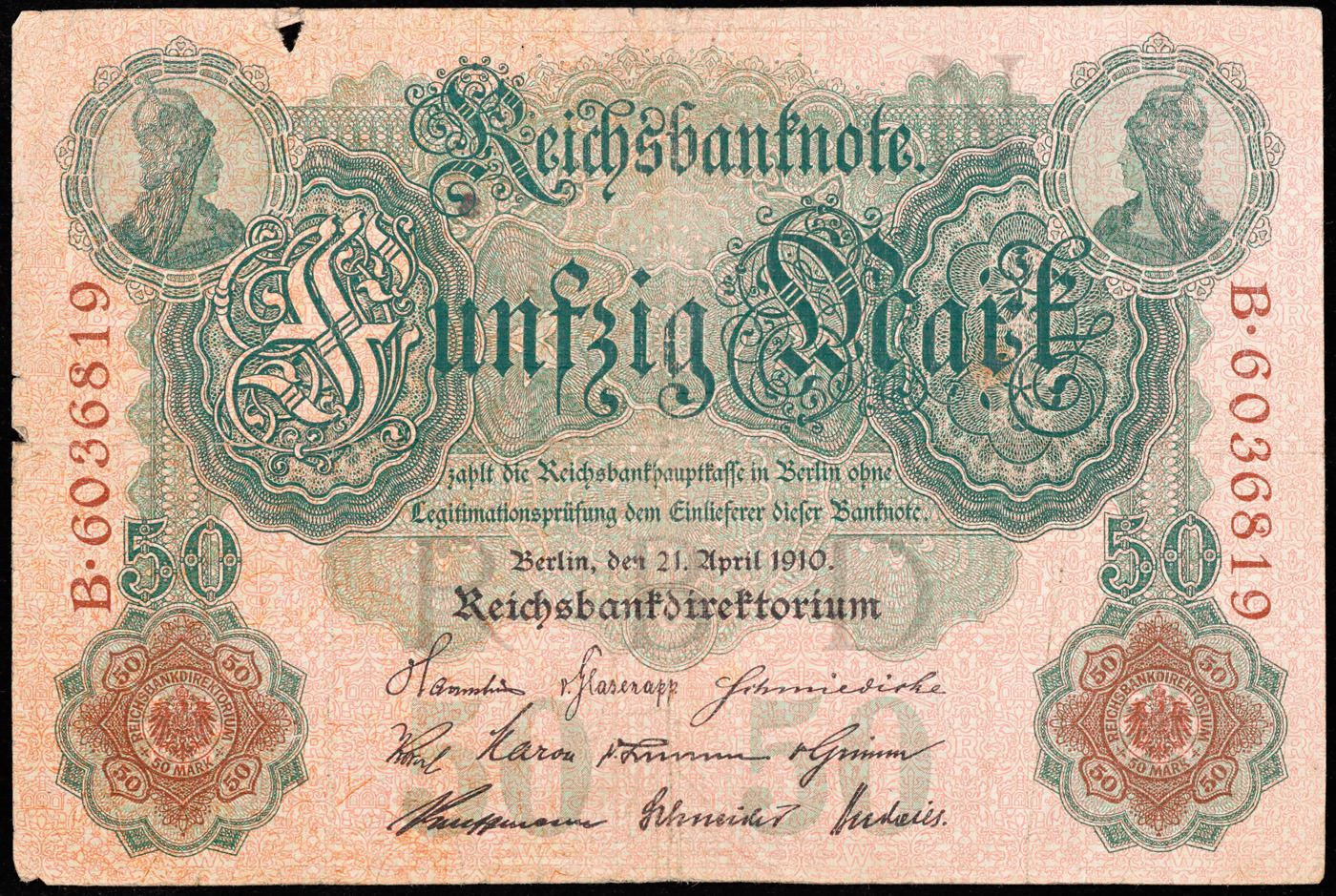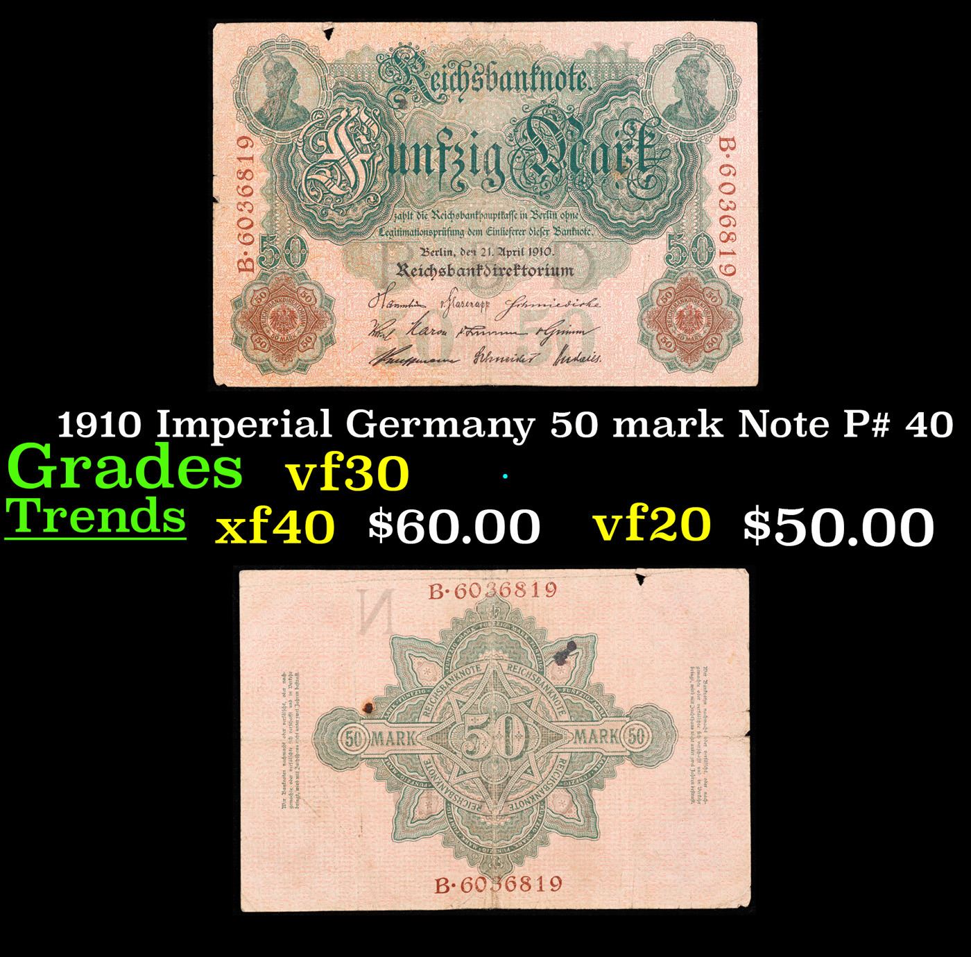 1910 Imperial Germany 50 mark Note P# 40 Grades vf++. From 1871 to 1914 the German Mark was known as the "Goldmark", as it was on the gold standard. During WWI, like most nations, Germany removed the gold backing and ceased circulation of gold coins. The Goldmark was the culmination of years of effort put into unifying the currency of Germany.