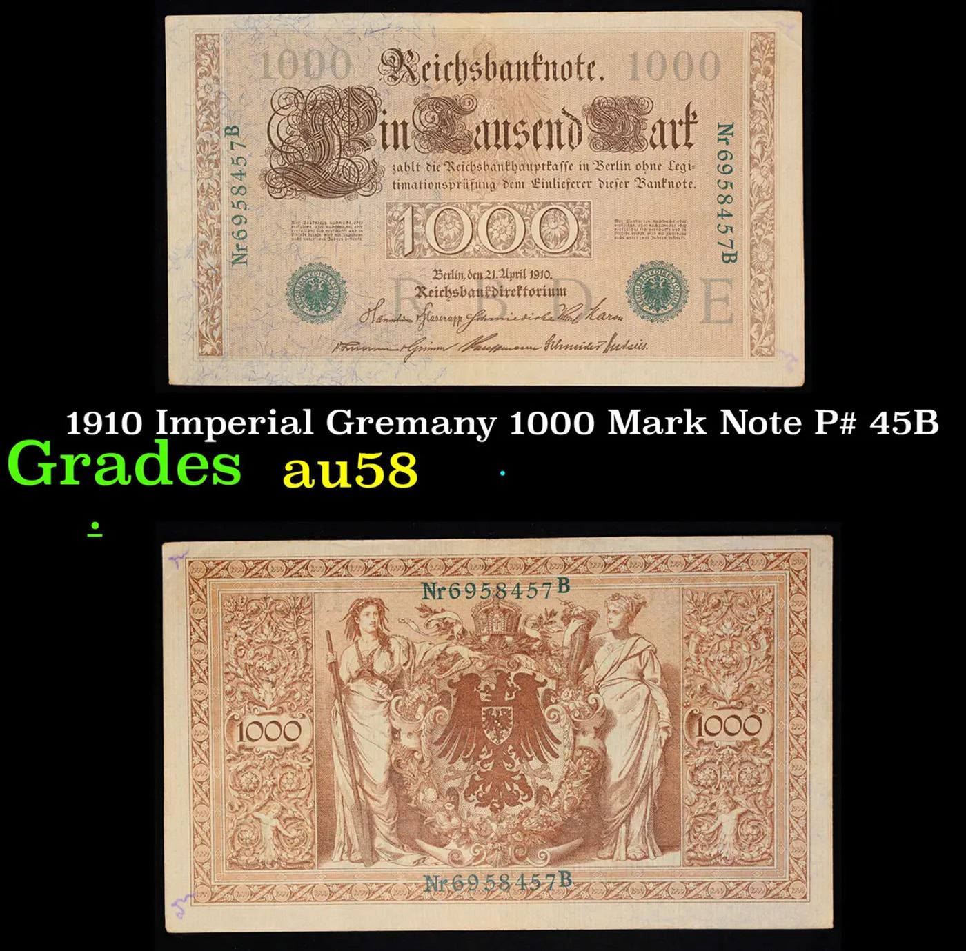 1910 Imperial Gremany 1000 Mark Note P# 45B Grades Choice AU/BU Slider. From 1871 to 1914 the German Mark was known as the "Goldmark", as it was on the gold standard. During WWI, like most nations, Germany removed the gold backing and ceased circulation of gold coins. The Goldmark was the culmination of years of effort put into unifying the currency of Germany.