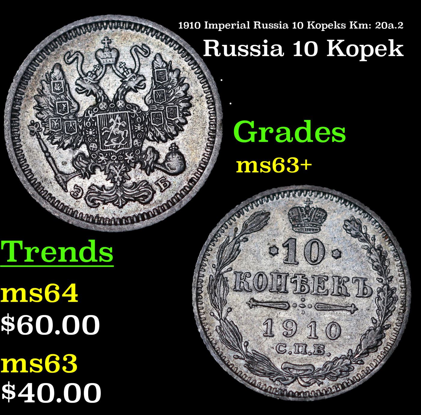 1910 Imperial Russia 10 Kopeks Km: 20a.2 Grades Select+ Unc.