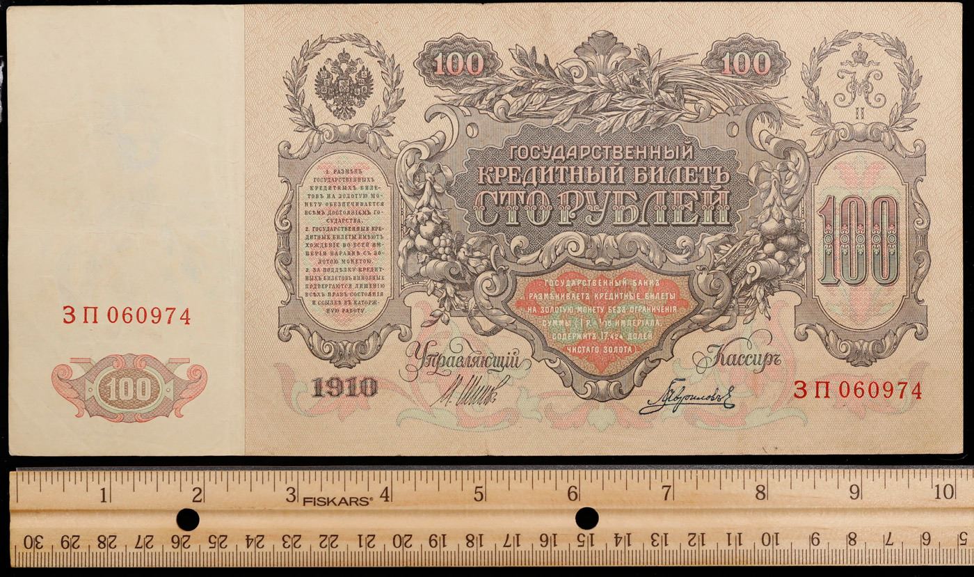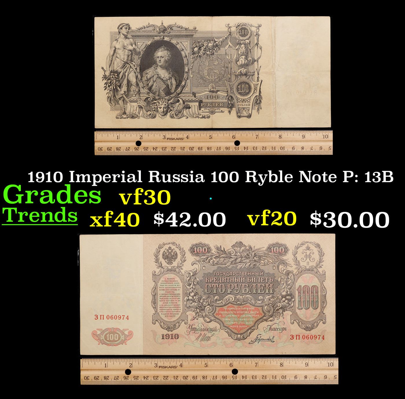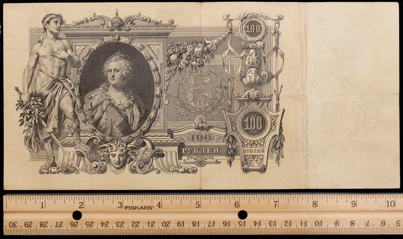 1910 Imperial Russia 100 Ryble Note P: 13B Grades vf++. The 1910 100 Ruble Note features a portrait and watermark of Tsarina Catherine the Great, as well as a young man with a sword and the coat of arms of the Russian Tsars. Additionally, it threatens counterfeiters with "the exclusion of all rights and one week hard labor".