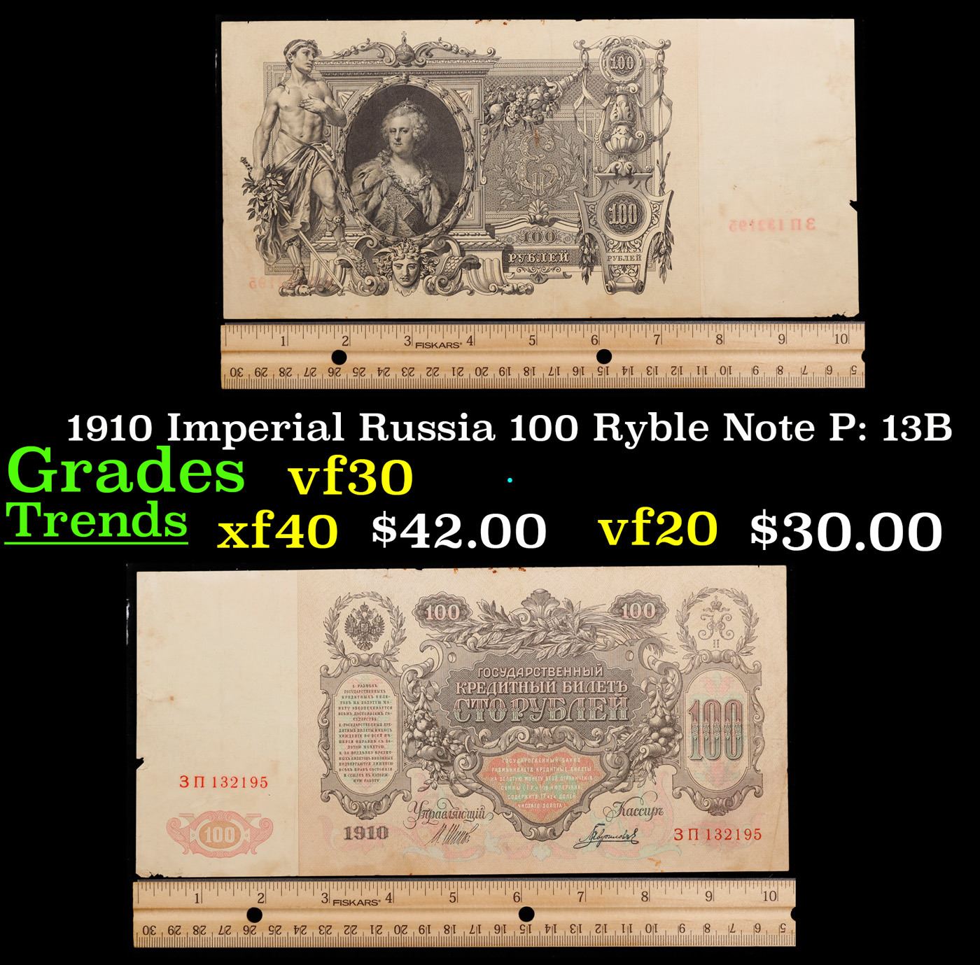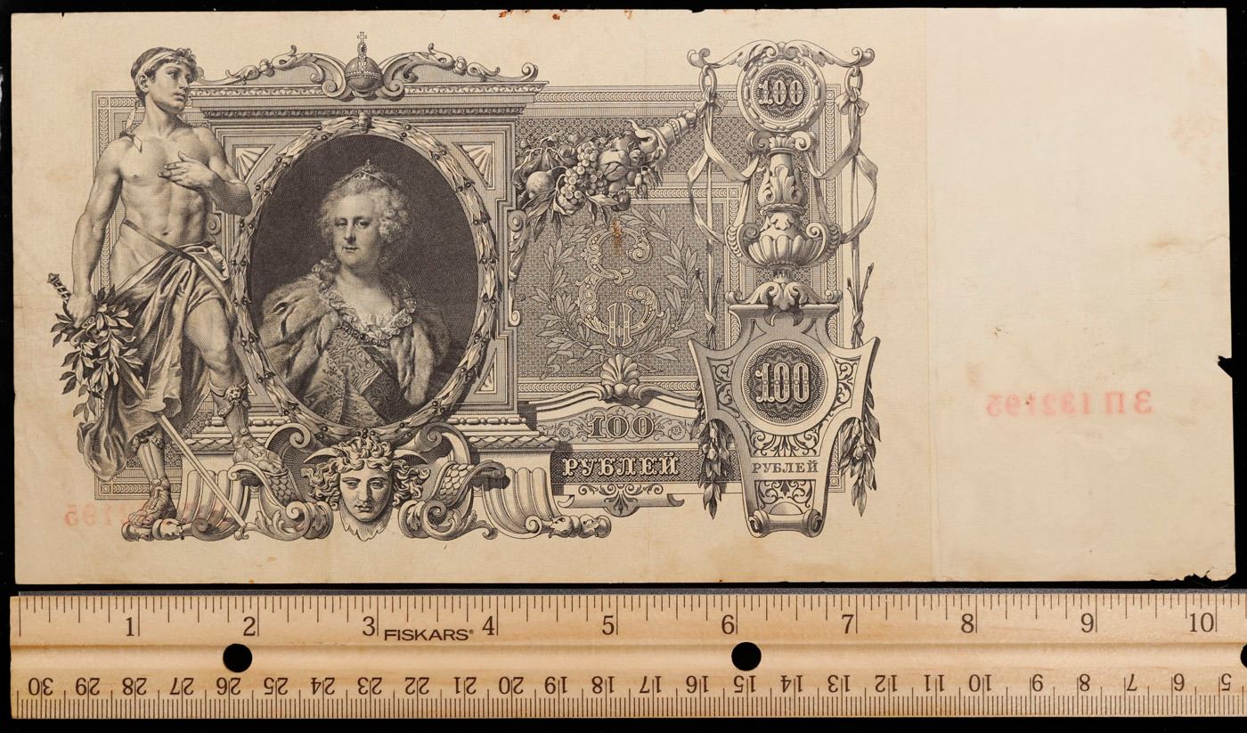 1910 Imperial Russia 100 Ryble Note P: 13B Grades vf++. The 1910 100 Ruble Note features a portrait and watermark of Tsarina Catherine the Great, as well as a young man with a sword and the coat of arms of the Russian Tsars. Additionally, it threatens counterfeiters with "the exclusion of all rights and one week hard labor".