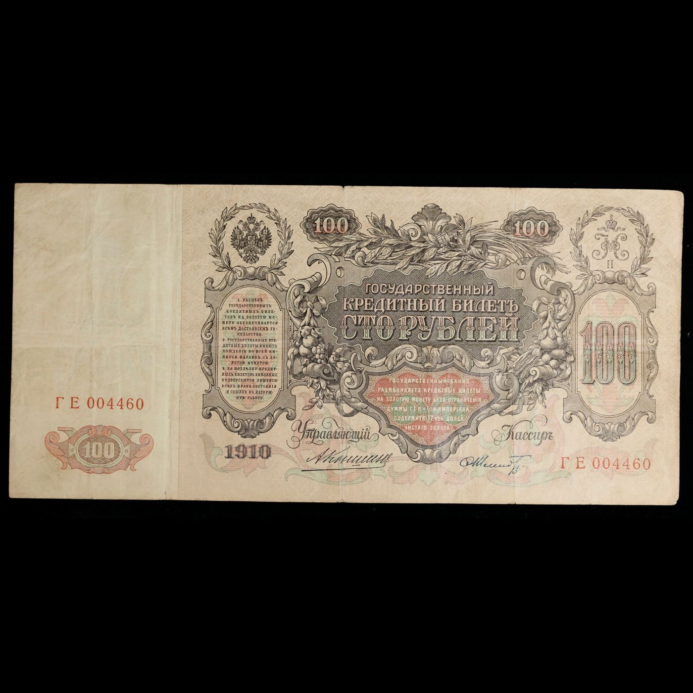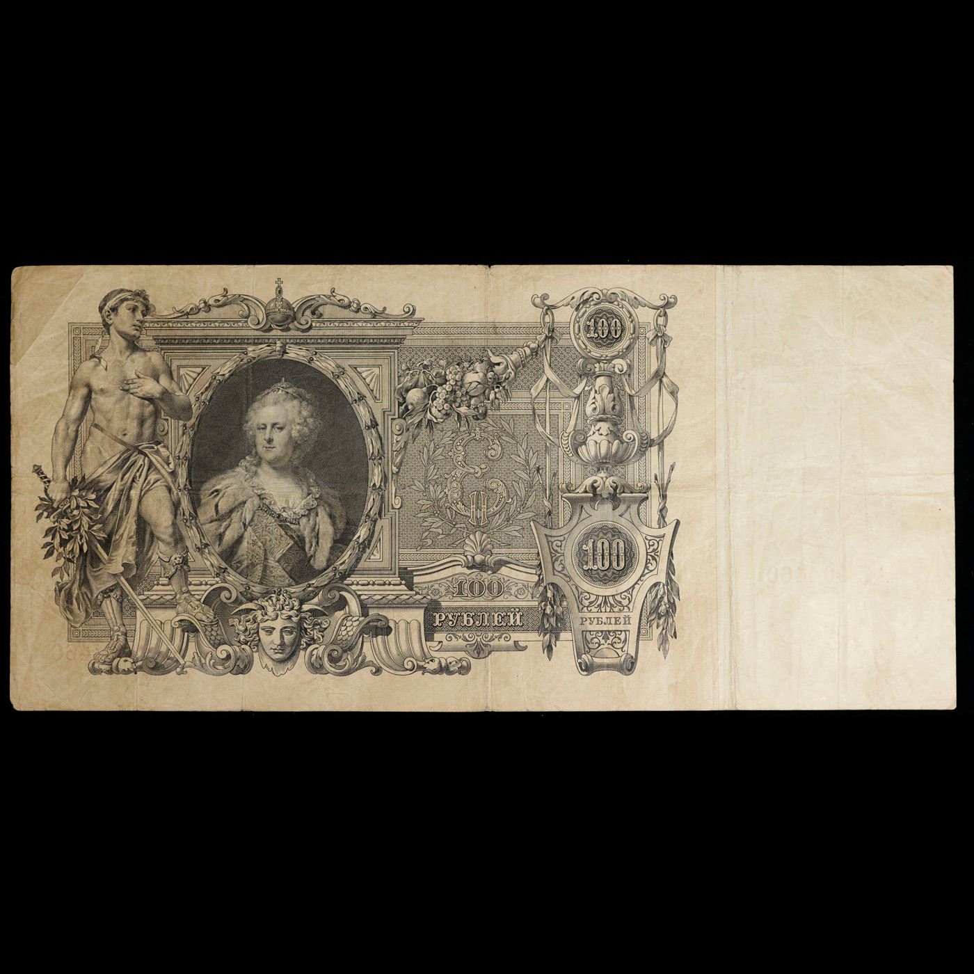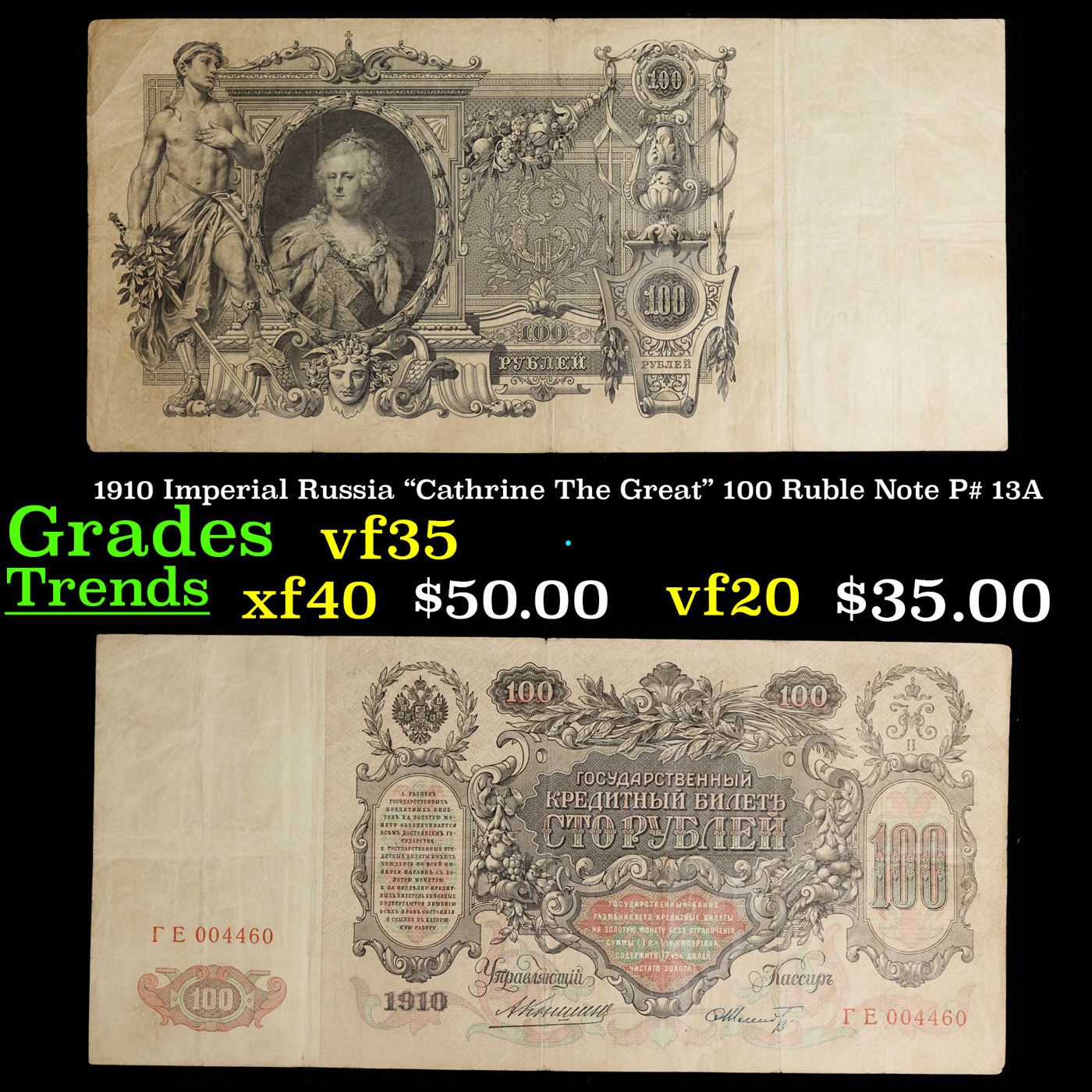 1910 Imperial Russia "Cathrine The Great" 100 Ruble Note P# 13A Grades vf++. The 1910 100 Ruble Note features a portrait and watermark of Tsarina Catherine the Great, as well as a young man with a sword and the coat of arms of the Russian Tsars. Additionally, it threatens counterfeiters with "the exclusion of all rights and one week hard labor".