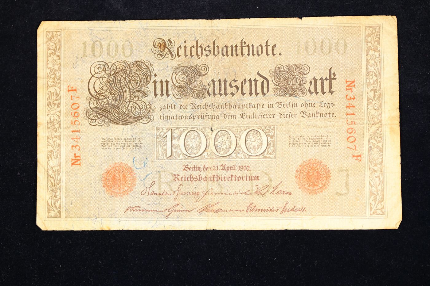 1910 Imperial germany 1,000 Mark Note P# 44B Grades vf+. From 1871 to 1914 the German Mark was known as the "Goldmark", as it was on the gold standard. During WWI, like most nations, Germany removed the gold backing and ceased circulation of gold coins. The Goldmark was the culmination of years of effort put into unifying the currency of Germany.