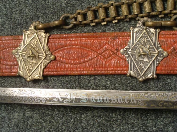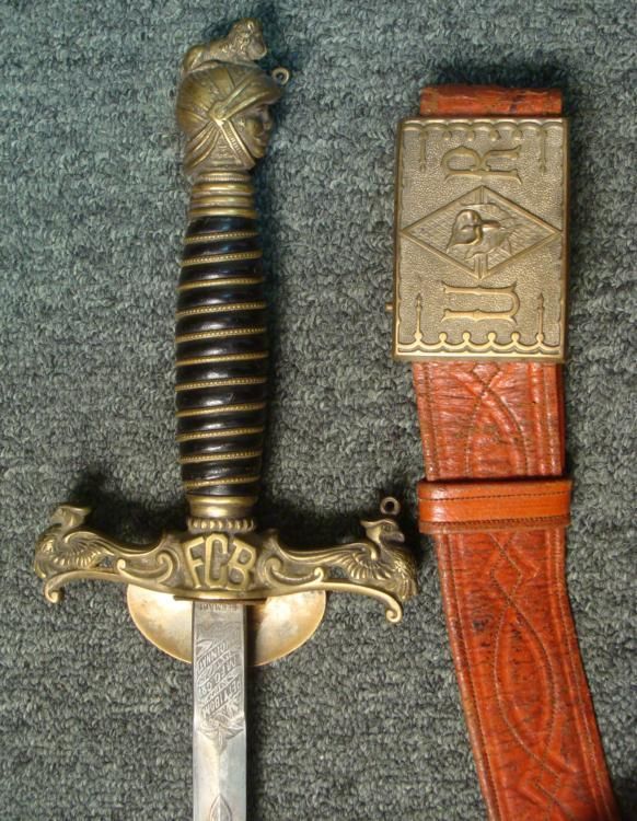 OFFERED HERE IS AN OUTSTANDINGN 1910 KNIGHTS OF PYTHIAS SECRET SOCIETY SWORD. THIS FINE FRATERNAL KNIGHTS OF PYTHIAS COMPLETE SWORD RIG IS FROM THE EARLY 1900'S. THE SWORD IS A BEAUTY, INCREDIBLY ORNATE AND IN GREAT CONDITION, AS IS THE REST OF THIS OFFERING. THE POMMEL IS A KNIGHTS HEAD WITH A LION ATOP THE HELMET. IT HAS A WELL WRAPPED LEATHER GRIP WITH BRASS WIRE, A CLAMSHELL CROSSGUARD WITH "UR" UNIFIED RANKS, AND HAS TWO DOVES AT EITHER END. THE SWORD BEAUTIFUL NAMED DOUBLE ETCHED BLADE WITH KNIGHTS, ANCIENT SCENES & SYMBOLS. BEAUTIFUL HIGHLIGHTING TO THE 28" BLADE. THE RICASSO MAKER IS NAMED TO THE PETTIBONE COMPANY OF CINCINNATI AND WAS MADE IN GERMANY FOR THE MAKER. SCABBARD IS EAQUALLY AS NICE AND ORNATE. IT HAS A FOUR STRAND METAL LINK SWORD HANGER WITH ATTACHED PANELS TO THE BELT. THE RED BELT IS STAMPED "PETTIBONE" AND THE BUCKLE IS A BRASS BEAUTY AND MARKED TO PETTIBONE ALSO. *