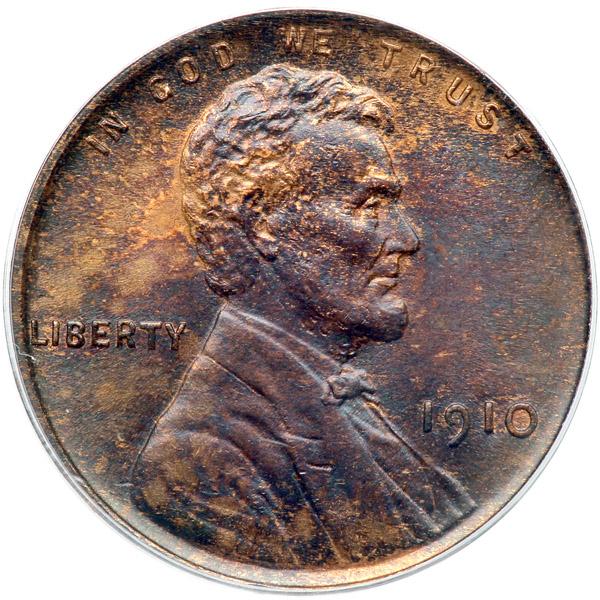 1910 Lincoln Cent. PCGS graded MS-64 Brown PQ. Boldly struck with lovely purple brown toning that has some residual tannish red color in a dappled form (PCGS # 2435) .