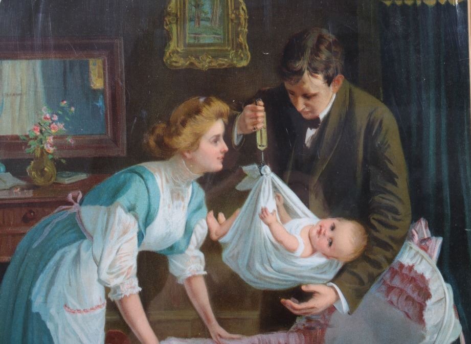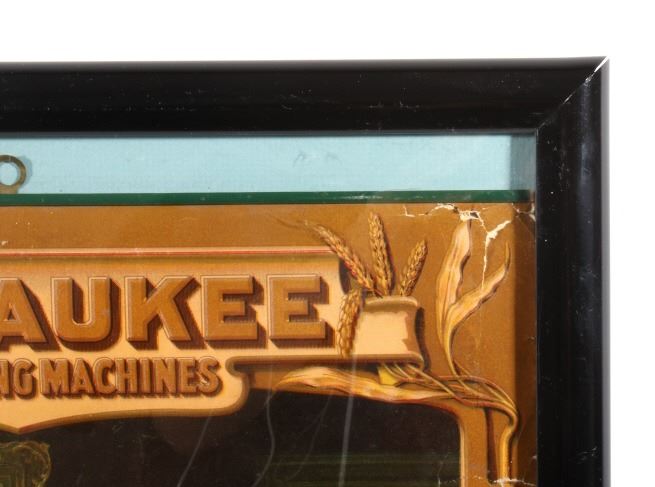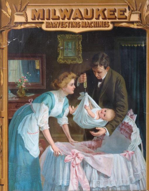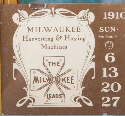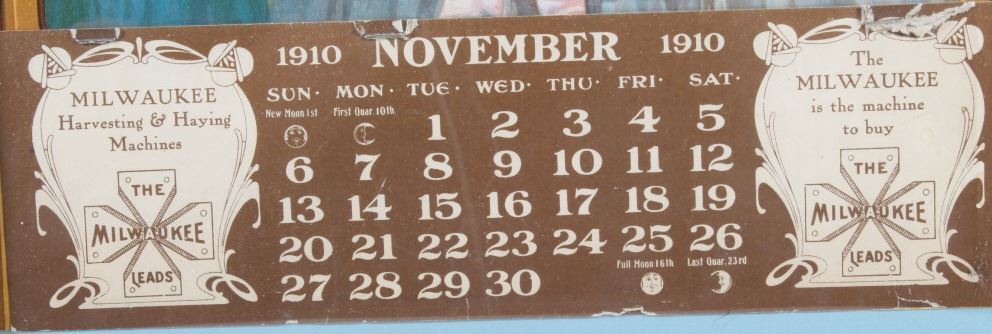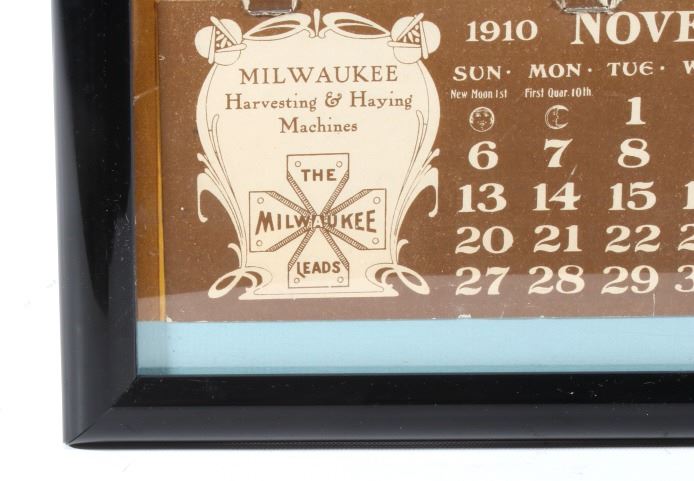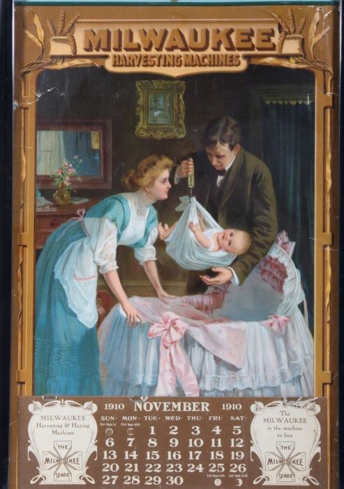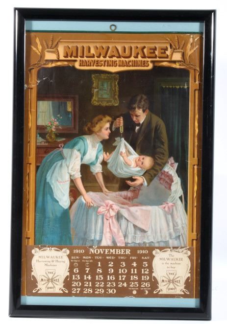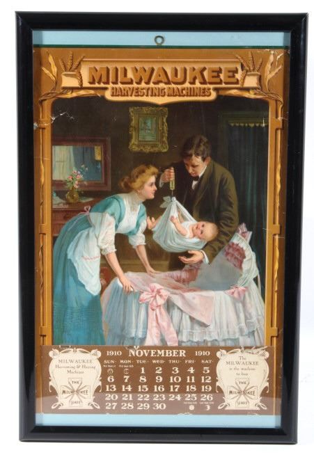 Featured in this lot we have a Milwaukee Harvesting Machines calendar for November 1910 with a lithograph above the calendar. The image on the lithograph shows a doctor weighting a baby with the mom watching, both are in period clothes and house furnishing. The calendar shows white badges on each side of the numbers, reading "Milwaukee Harvesting & Haying Machines - The Milwaukee Leads". The top of the lithograph is marked "Milwaukee Harvesting Machines". The piece is set in a glossy black frame with a light blue background. It shows good condition for its age with some wear on the calendar. The frame measures 15" wide by 23" tall. The calendar was said to be from Livingston, Montana.