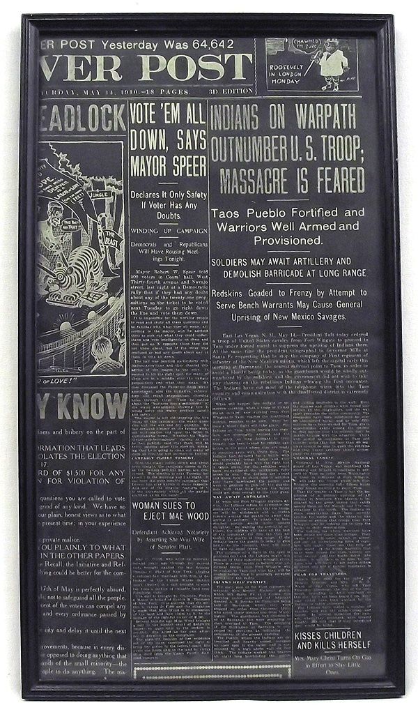 Copy of Page from the May 14, 1910 Denver Post Newspaper.  White print on black background, articles about ''Indians on the Warpath Outnumber US Troop'' and ''Vote 'Em all Down, Says Mayor Speer'' are examples.  17.75''H x 9 5/8''W, this would truly be a conversation piece as it covers the last known Indian rebellion.