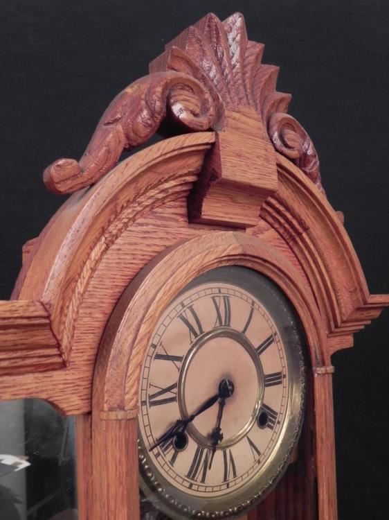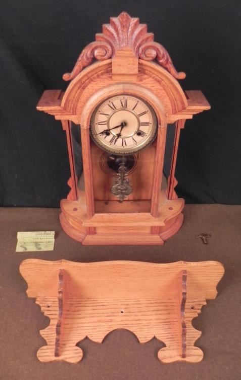 OUTSTANDING 1910 OXFORD 8 DAY SPRING STRIKE ON 1/2 HOUR CLOCK & SHELF CLOCK IS 23 X 14 1/2"--ROMAN NUMERAL DIAL-DOUBLE WINDER WITH KEY-OXFORD 8 DAY0SPRING STRIKE-STRIKES ON THE 1/2 HOUR-WAS A WEDDING GIFT ON JUNE 5. 1911--REFURBISHED IN 1978--SIDES HAVE CURVED MIRRORS-COMES WITH MATCHING SHELF--CARVED WOOD-