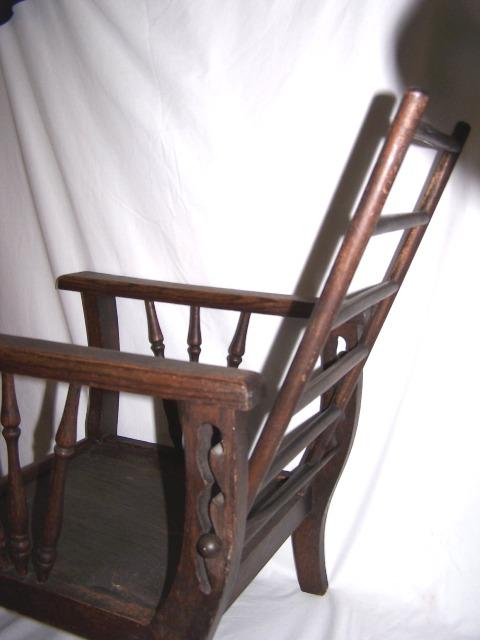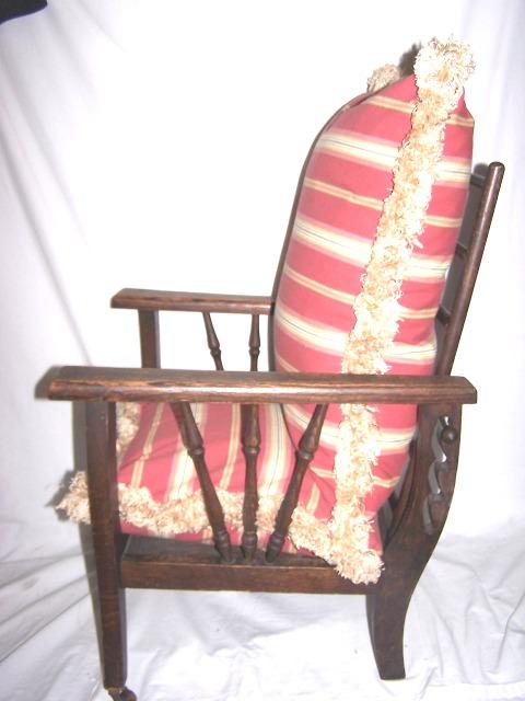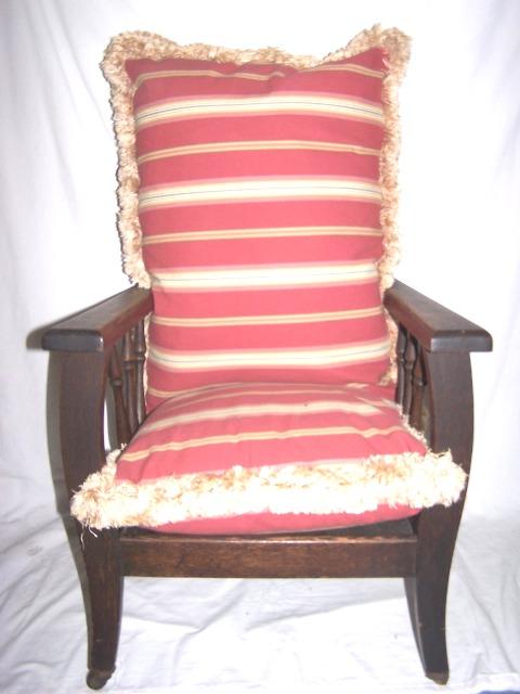 Original 1910 great childs oak morris or recliner chair. Original finish, yet cushions have been professionally replaced. Approx 26" x 20" x 20".