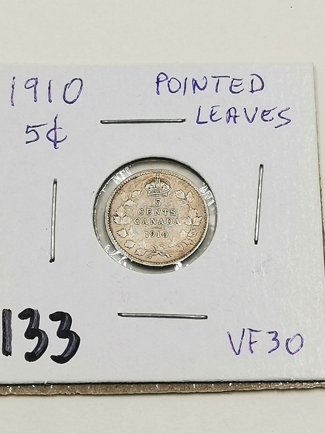 1910 Pointed Leaves, Silver 5 Cent Coin, VF30