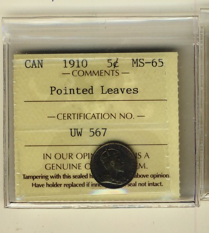 1910 Pointed Lvs. 5¢ ICCS MS65, attractively toned. Superb example.
